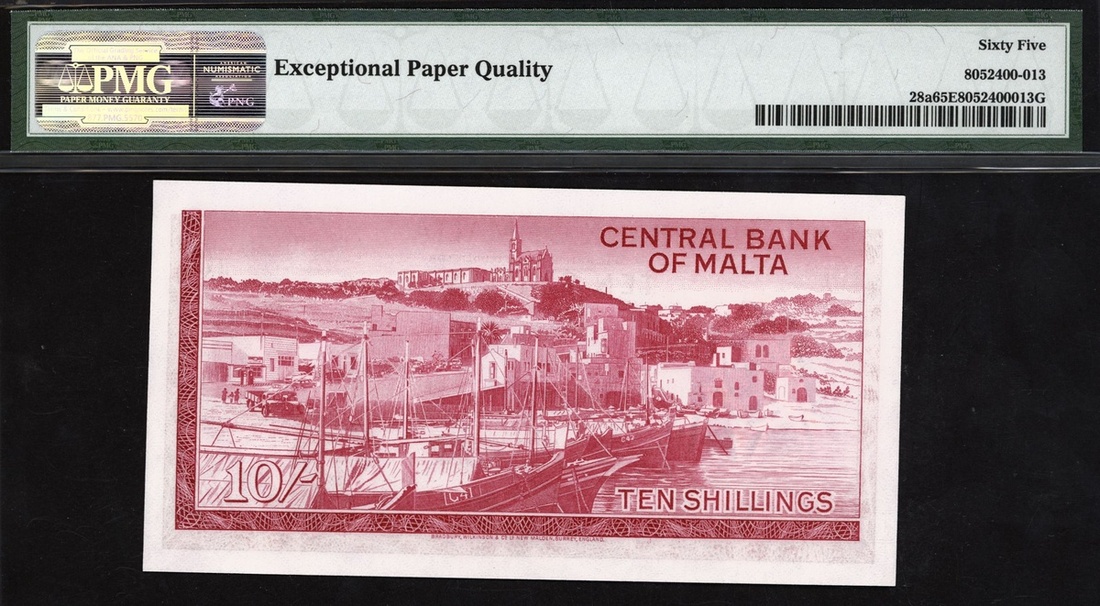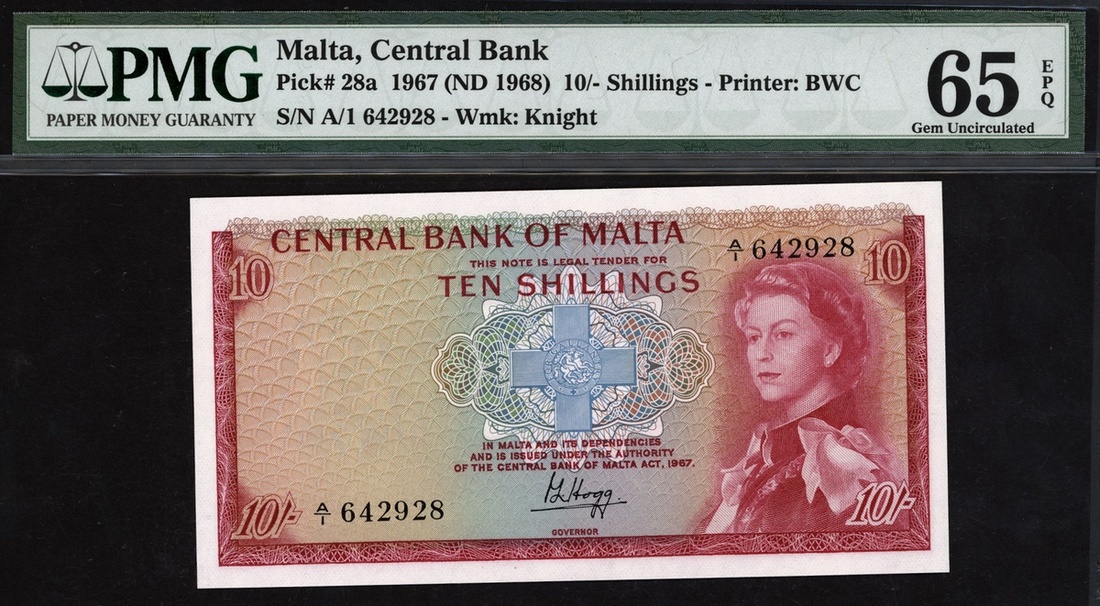 (x) Central Bank of Malta, 10 shillings, L.1967 (ND 1968), serial number A/1 642928, (Pick 28a, BNB B201), in PMG holder 65 EPQ Gem Uncirculated