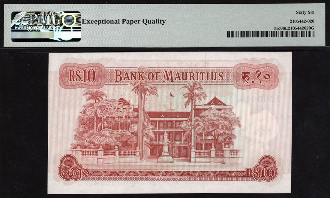(x) Bank of Mauritius, 10 rupees, ND (1967), serial number A/48 000048, (Pick 31c, BNB B402c), in PMG holder 66 EPQ Gem Uncirculated, low number