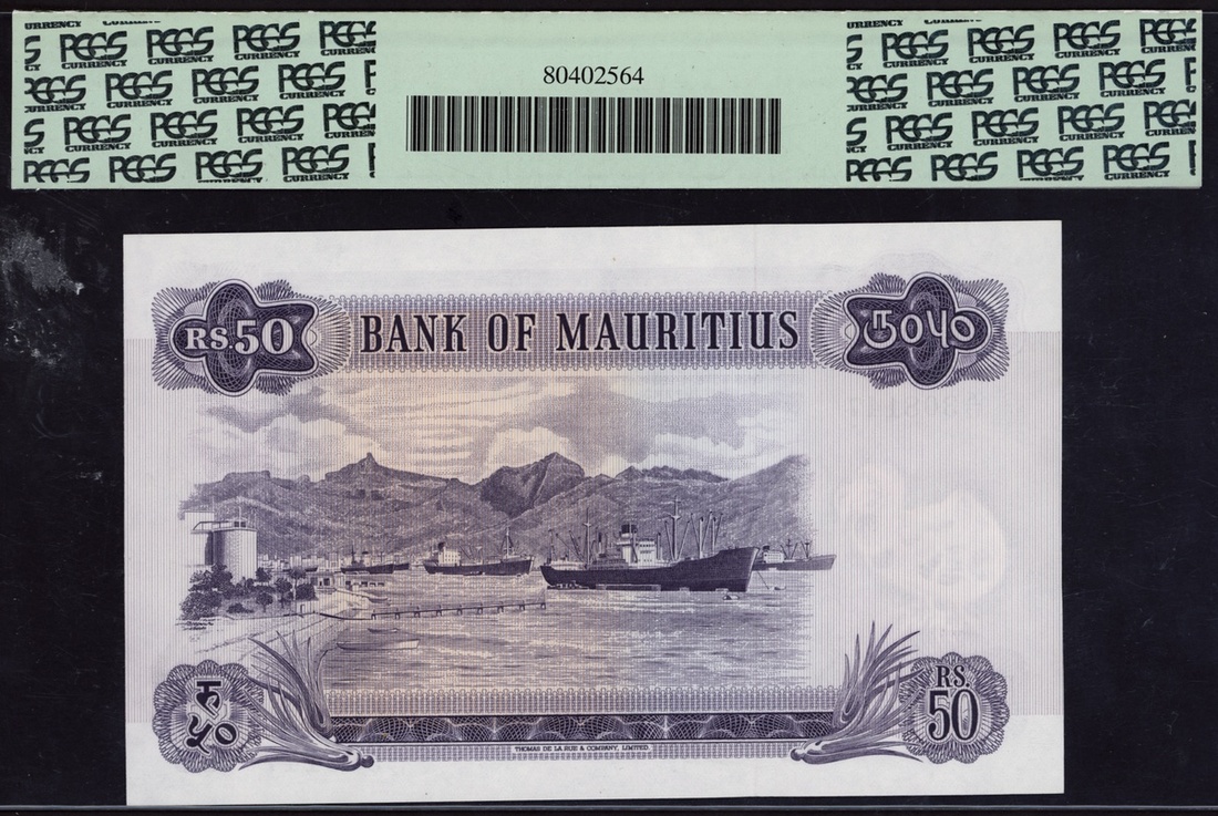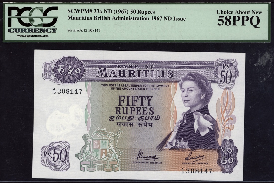 (x) Bank of Mauritius, 50 rupees, ND (1967), serial number A/12 308147, (Pick 33a), in PCGS 58PPQ Choice About New