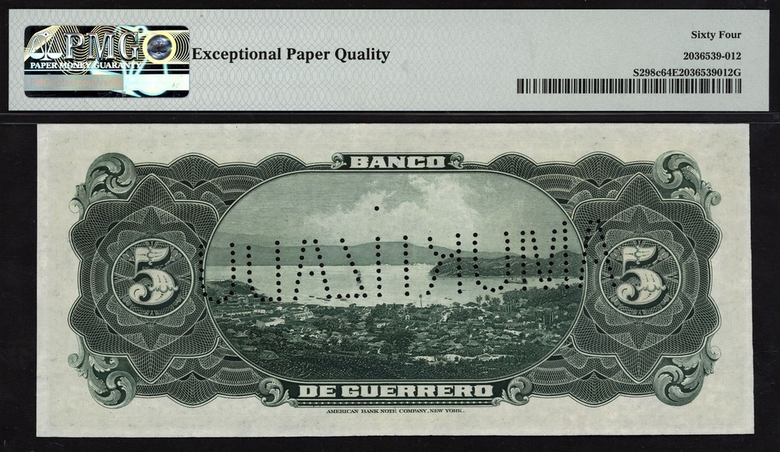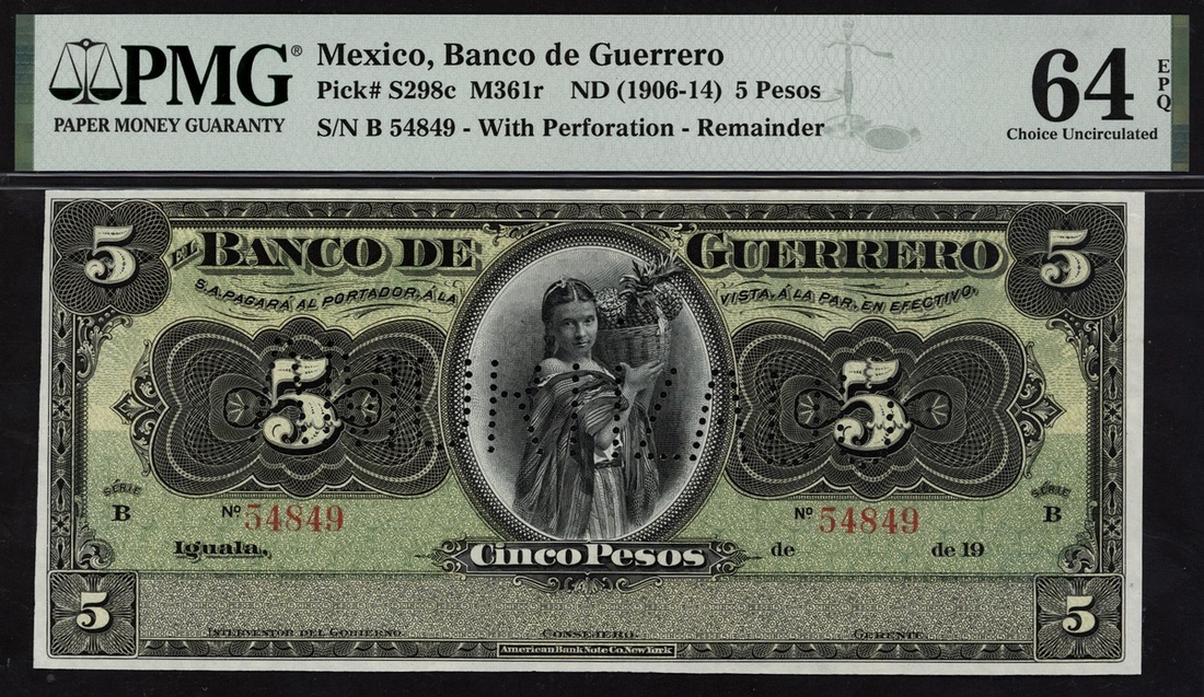 (x) Banco de Guerrero, Mexico, 5 pesos, ND (1906-14), serial number B 54849, (Pick S298c), in PMG holder 64 EPQ Choice Uncirculated
