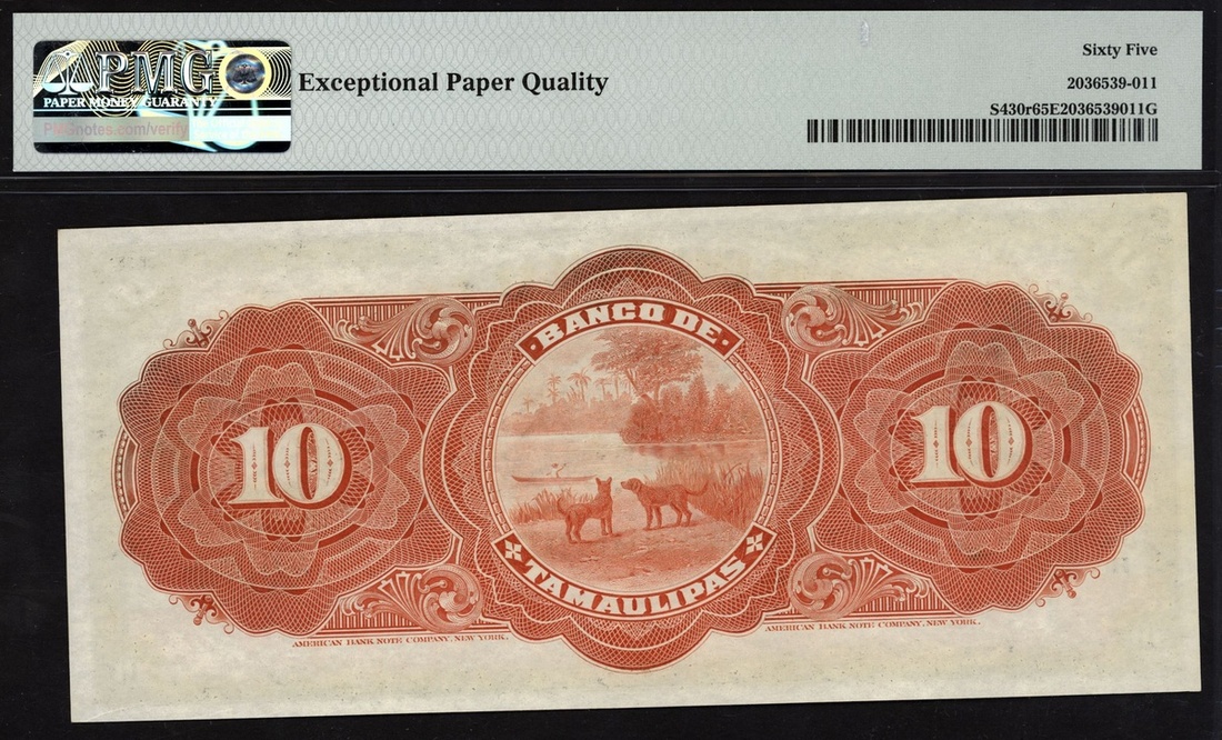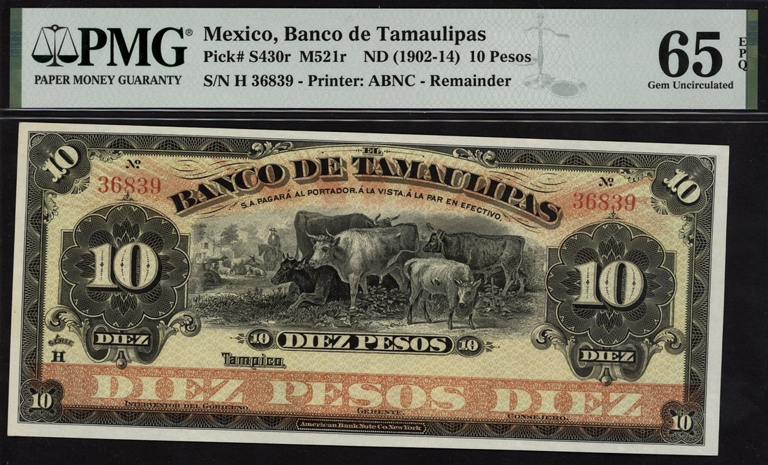 (x) Banco de Tamaulipas, 10 pesos, ND (1902-14), serial number H 36839, (Pick S430r), in PMG holder 65 EPQ Gem Uncirculated (1 finer)
