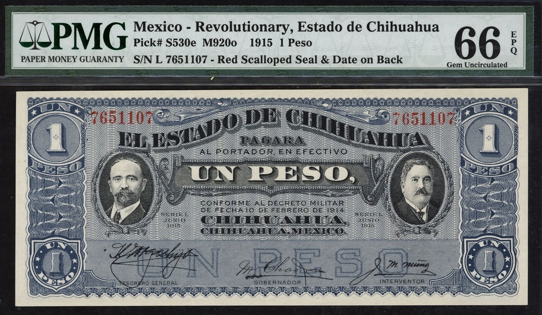(x) Mexico, 1 peso, 1915, serial number L 7651107, (Pick S530e), in PMG holder 66 EPQ Gem Uncirculated