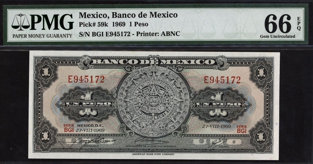 (x) Banco de Mexico, 1 peso, 1969, serial number BGI E945172, (Pick 59k), in PMG holder 66 EPQ Gem Uncirculated