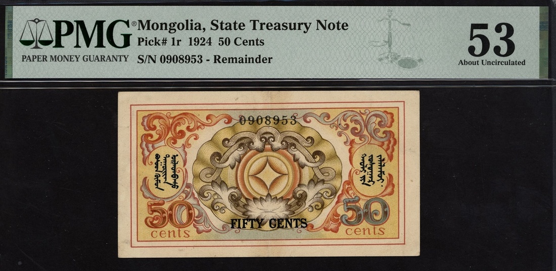 Mongolia, State Treasury Note, 50 cents, 1924, serial number 0908953, ornate design