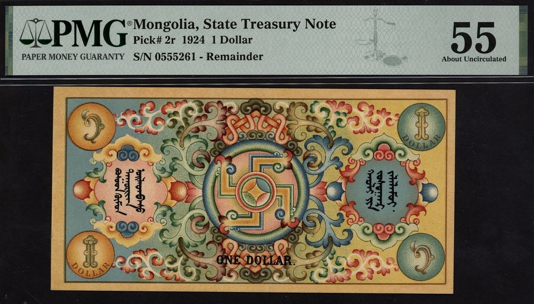 Mongolia, State Treasury Note, 1 dollars, 1924, serial number 0555261, ornate design,