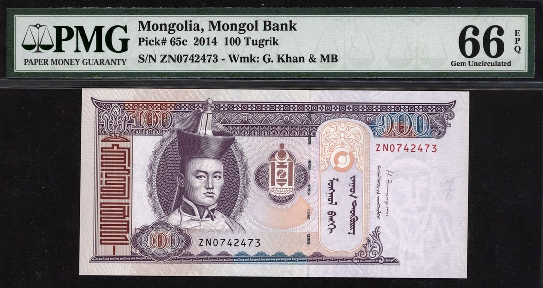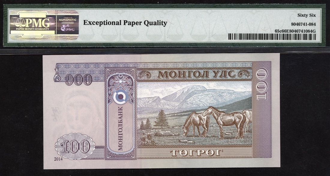 (x) Mongolia, 100 tugrik, 2014, serial number ZN0742473, (Pick 65c), in PMG holder 66 EPQ Gem Uncirculated
