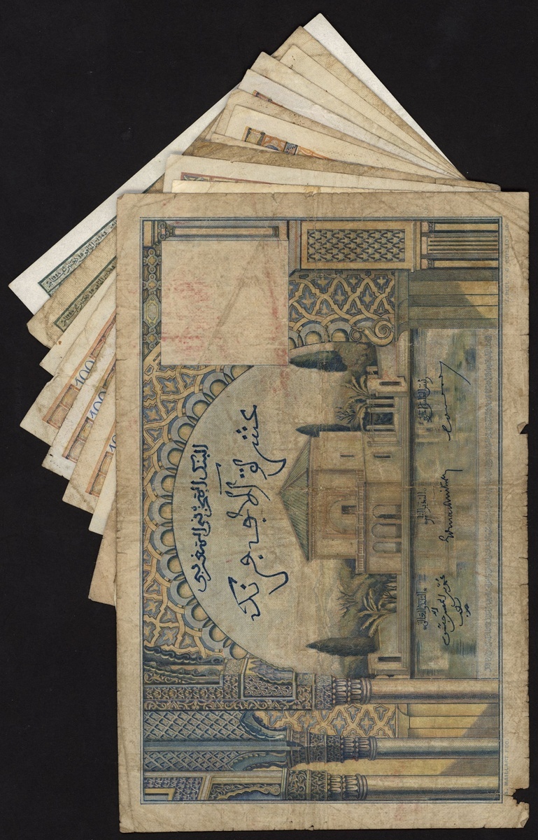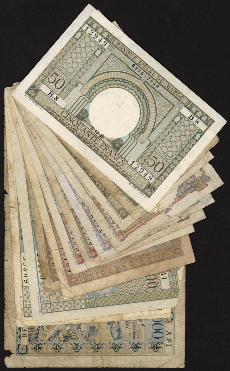 Banque d'Etat du Maroc, a group of the 1948-58 issues, including 50 francs (3) 1949, 100 francs (4) 1951, 1952, 500 francs (2), 1000 francs (2), 10,000 francs (1) 1953,