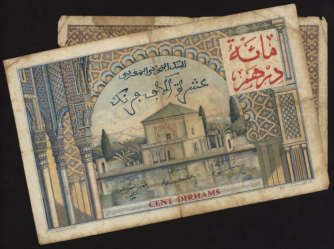 Banque du Marco, a pair of the 1953-55 provisional issues, 50 dirhams on 5000 francs and 1000 dirhams on 10000 francs, (Pick 51, 52), both about fine (2 notes)