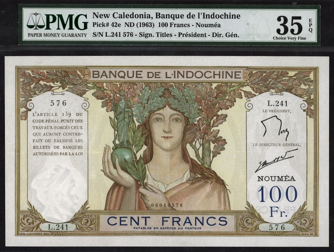 (x) Banque de l'Indochine, New Caledonia, 100 francs, ND (1963), serial number L.241 576, (Pick 42e), in PMG holder 35 EPQ Choice Very Fine