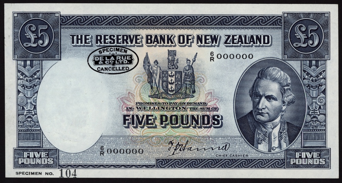 Reserve Bank of New Zealand, specimen £5, ND (1940-55), serial number 6R 000000, (Pick 160as, BNB B107s) first signature, mounted on paper sheet (originally from TDLR presentational booklet), rare