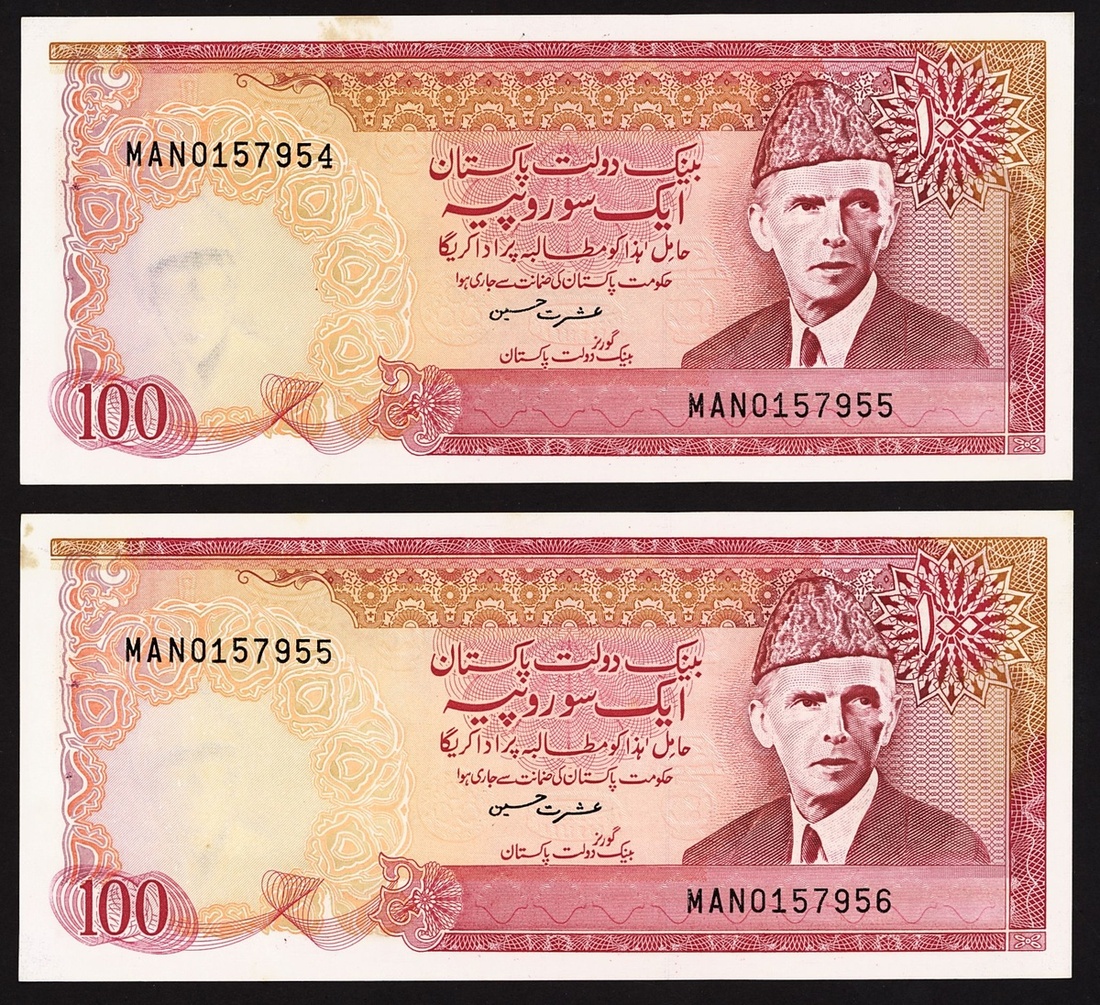 (x) State Bank of Pakistan, ERROR pair of 100 rupees, ND (1986), mismatch serial numbers, (Pick 41, BNB B226c), usual pinholes at left, foxing at corner, otherwise uncirculated (2 notes)