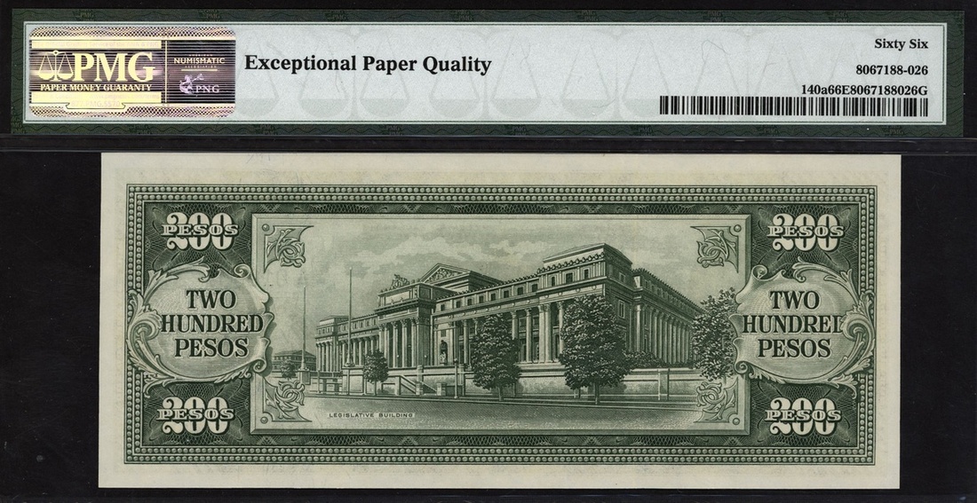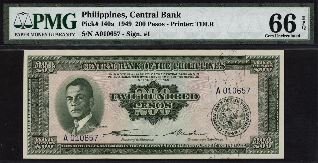 (x) Central Bank of Philippines, 200 pesos, 1949, serial number A010657, (Pick 140a), in PMG holder 66 EPQ Gem Uncirculated
