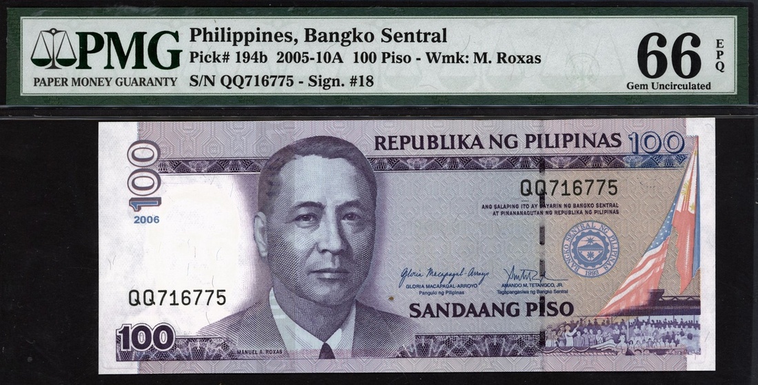 (x) Central Bank of Philippines, 100 piso, 2005-10A, serial number QQ716775, (Pick 194b), in PMG holder 66 EPQ Gem Uncirculated