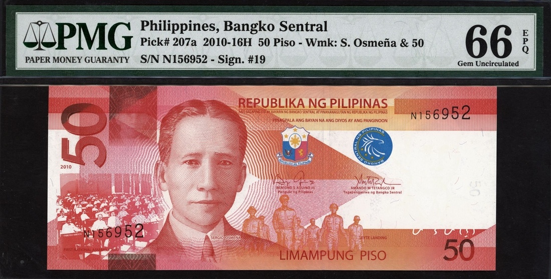 (x) Central Bank of Philippines, 50 piso, 2010, serial number N156952, (Pick 207a), in PMG holder 66 EPQ Gem Uncirculated