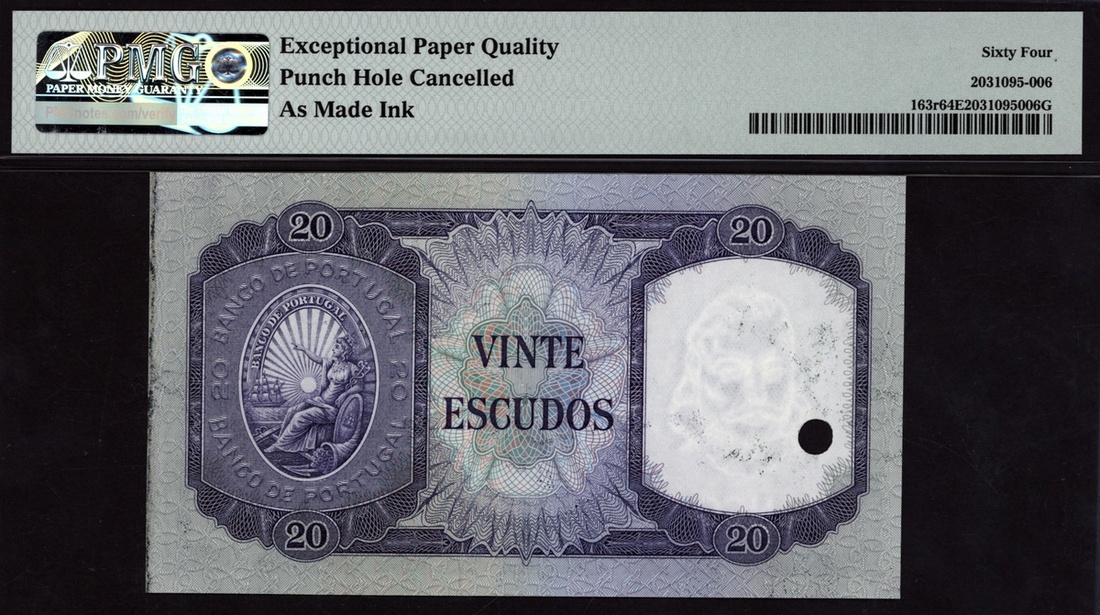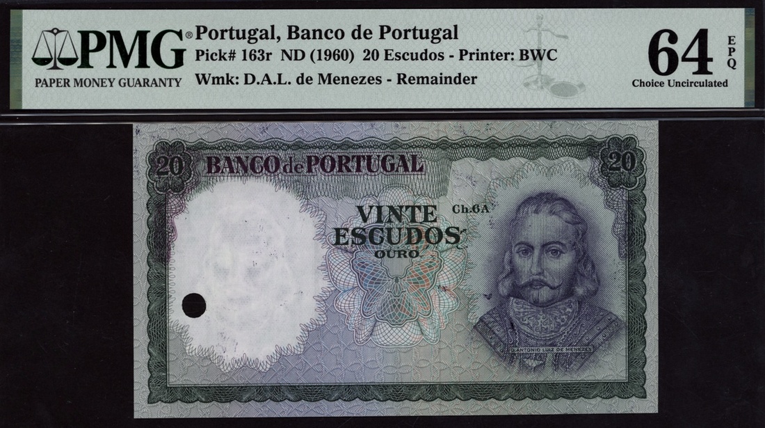 (x) Banco de Portugal, remainder 20 escudos, ND (1960), (Pick 163r), in PMG 64 EPQ Choice Uncirculated, punch hole cancelled, as made ink