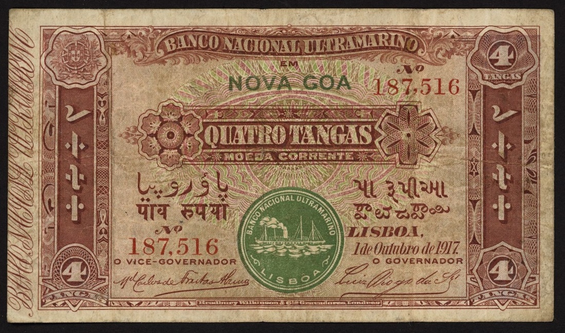 Banco Nacional Ultramarino, Portuguese India, 4 tangas, 1917, serial number 187,516, (Pick 19, BNB305a good fine, scarce