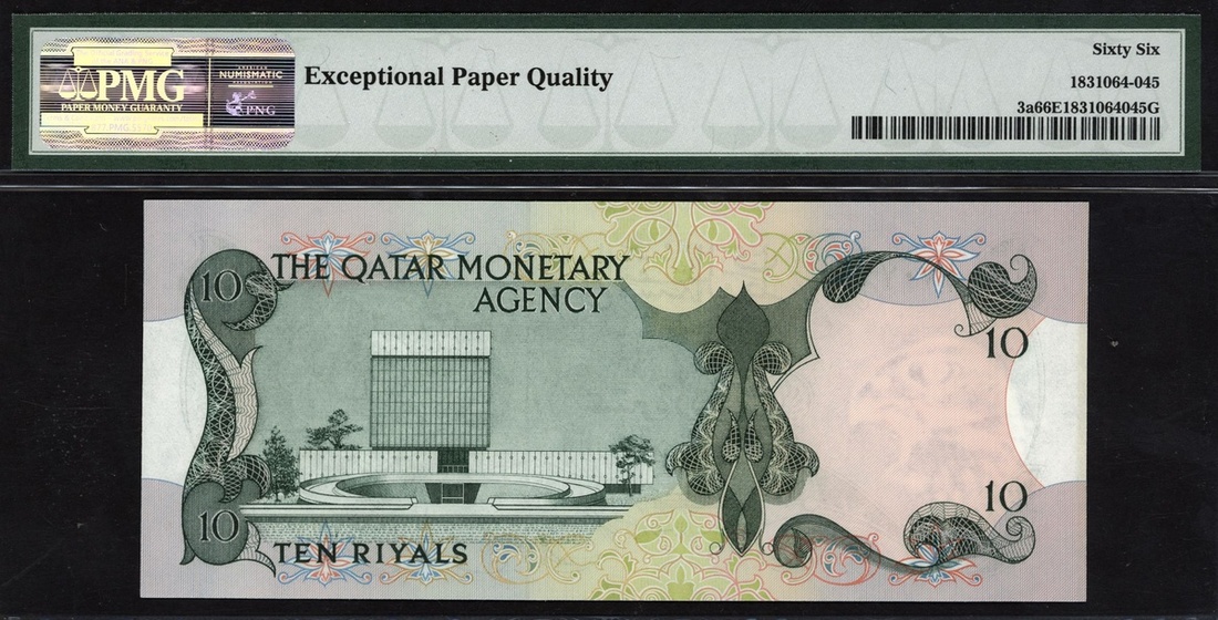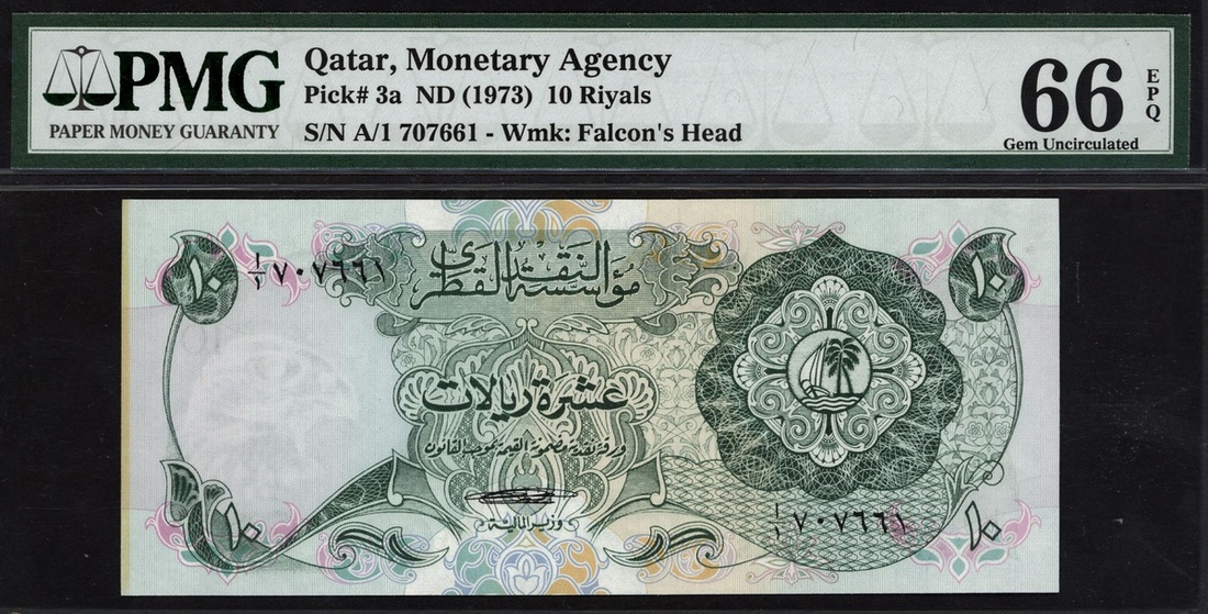 Qatar Monetary Agency, 10 riyals (2), ND (1973), serial number A/1 707661, (Pick 3a), in PMG holder 66 EPQ Gem Uncirculated