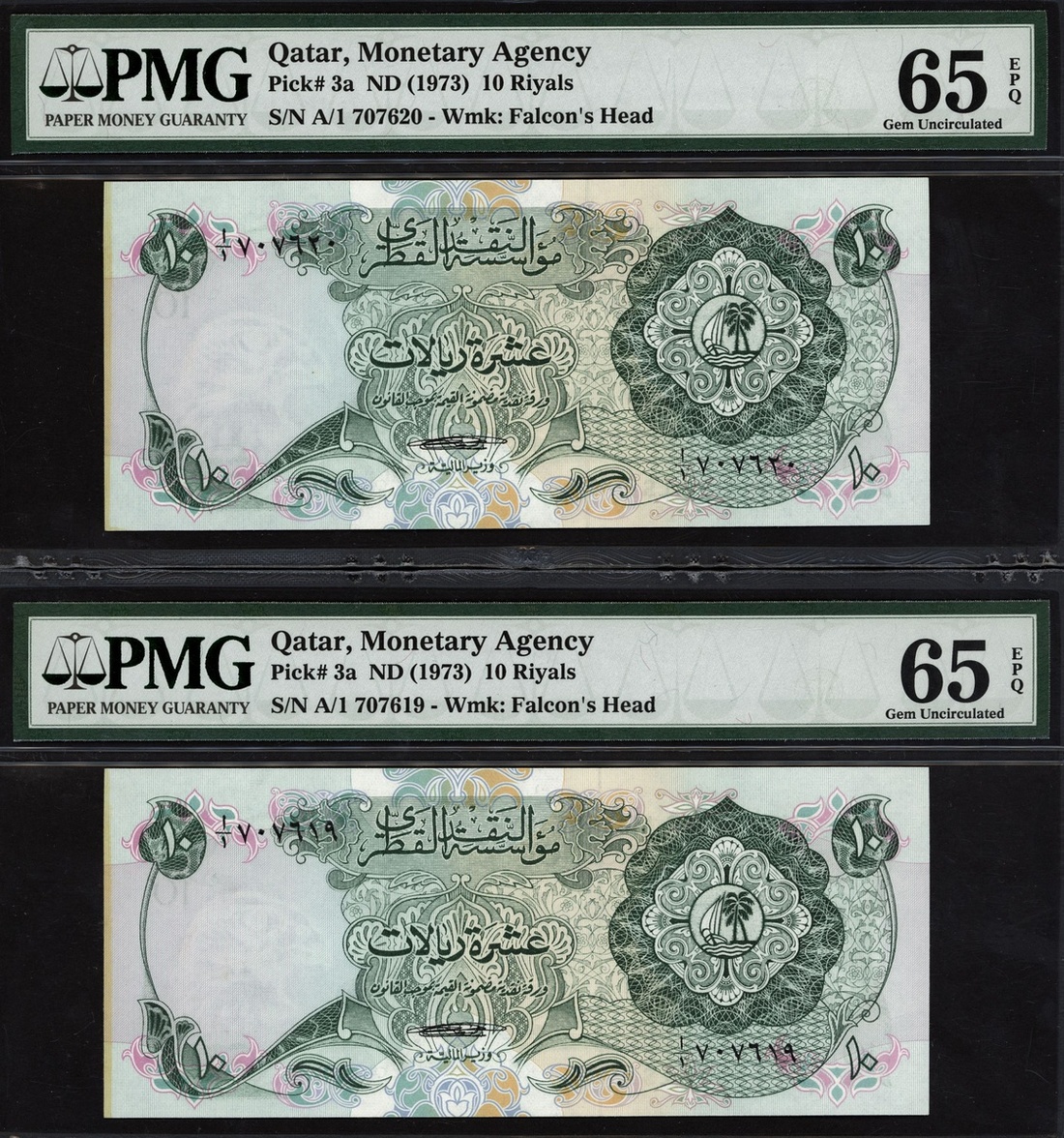 Qatar Monetary Agency, consecutive pair of 10 riyals (2), ND (1973), serial number A/1 707619/20, (Pick 3a), both in PMG holders 65 EPQ Gem Uncirculated