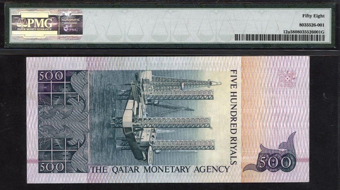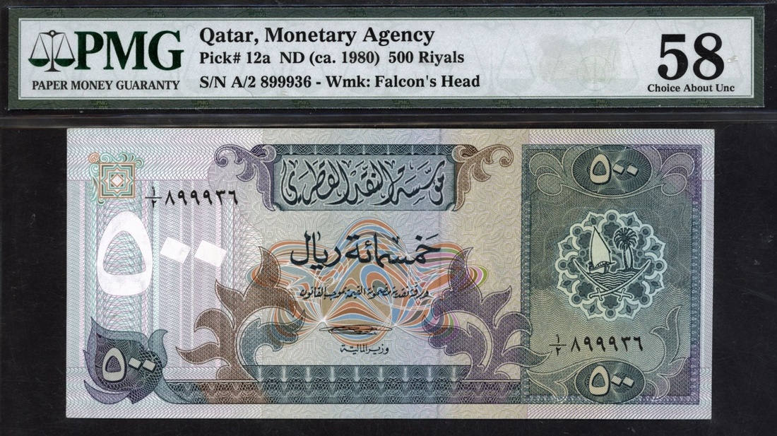 (x) The Qatar Monetary Agency, 500 riyals, ND (ca. 1980), serial number A/2 899936, (Pick 12a), in PMG holder 58 Choice About Uncirculated