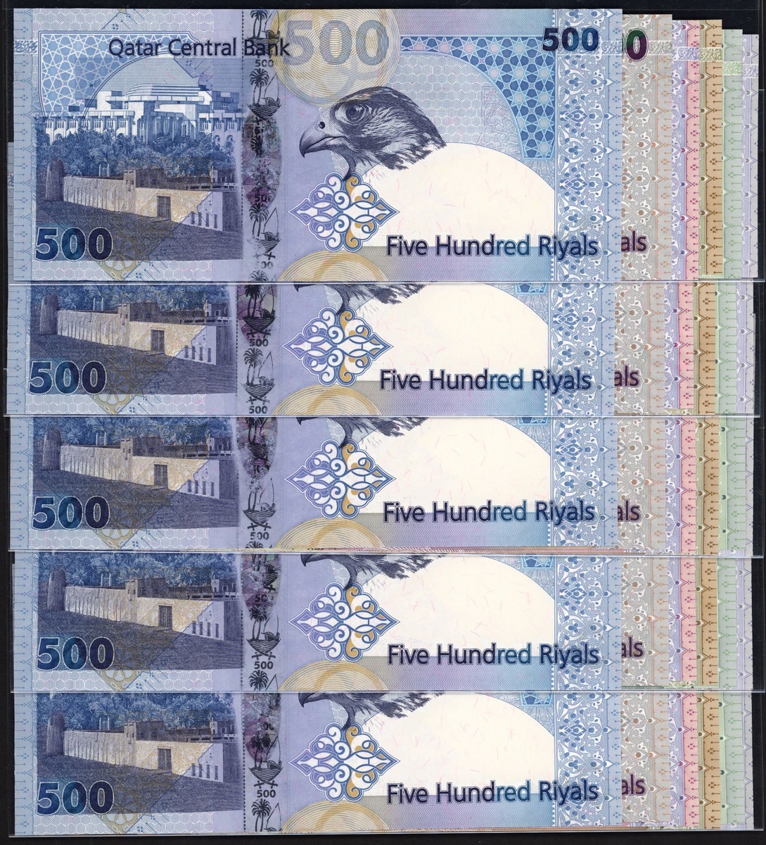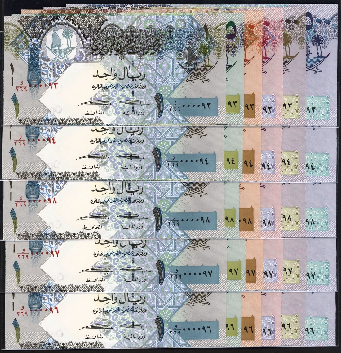 Qatar Central Bank, five complete sets of the issue comprising 1, 5, 10, 50, 100 and 500 riyals, ND (2015/2008/2007), with low serial numbers 93/94/96/97/98, (Pick 28b, 29a, 30a, 31a, 26a, 27a, TBB B215b, 216a, 217a, 218a, 213a, 214a), uncirculated and rare complete sets of low number notes (30 notes)
