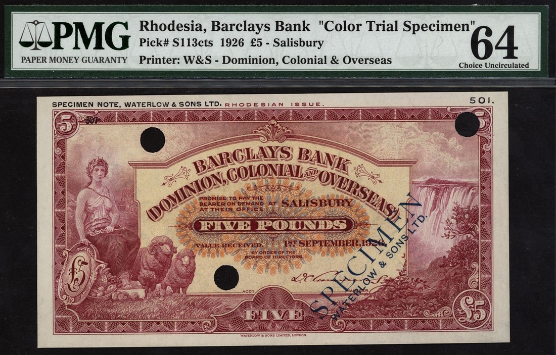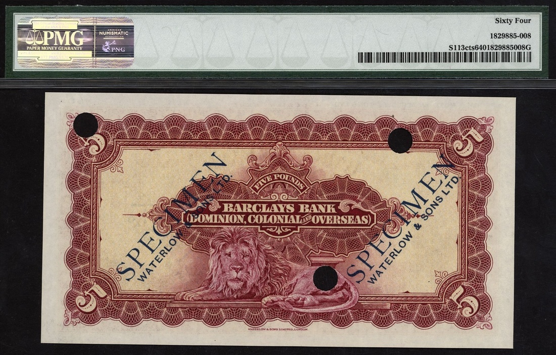 (Pick S113cts), blue SPECIMEN WATERLOW & SONS LIMITED overprint, perforated, in PMG holder 64 choice uncirculated, attractive and very rare