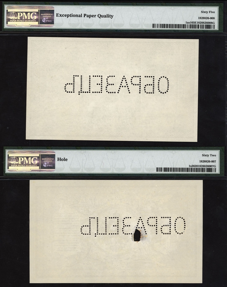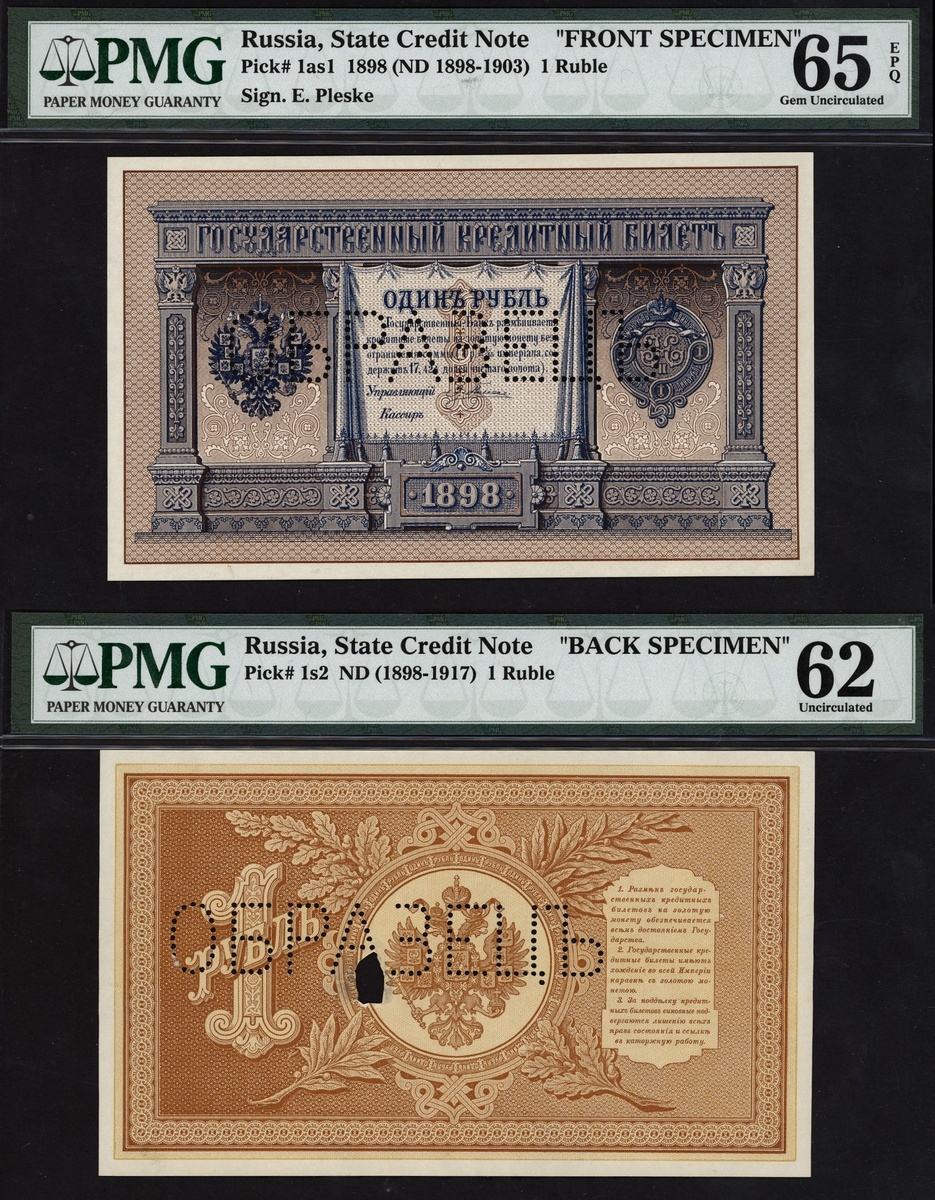 (Pick 1s1, 1s2, RPM 1.14.1O), perforated specimen (obrazets) in Cyrillic, in PMG holders obverse 65 EPQ Gem Uncirculated, reverse 62 Hole Uncirculated, excessively rare (2 notes)