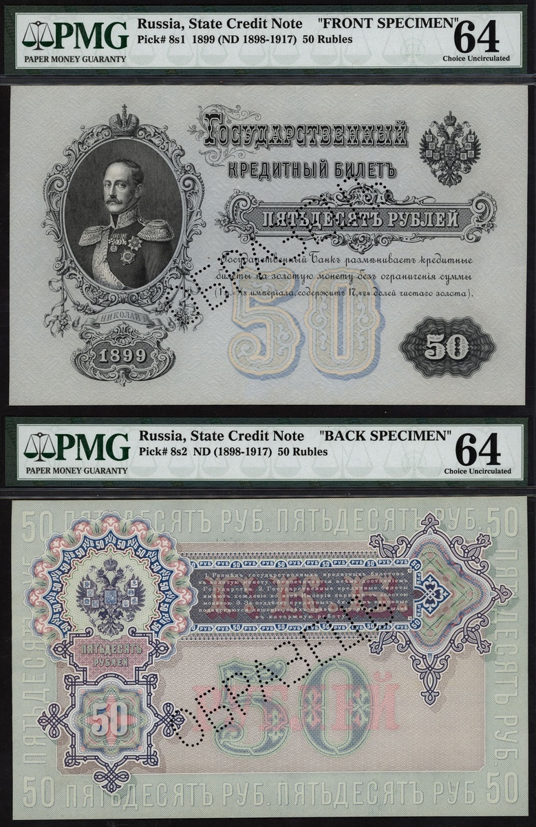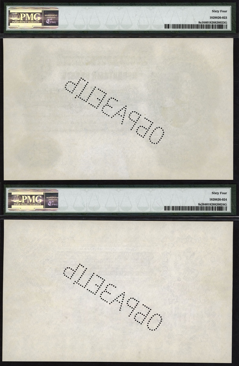 (Pick 8s1, 8s2, RPM unlisted, for similar 1.14.51O), perforated specimen (obrazets) in Cyrillic, in PMG holders both 64 Choice Uncirculated, intricate and beautiful design, very rare (2 notes)