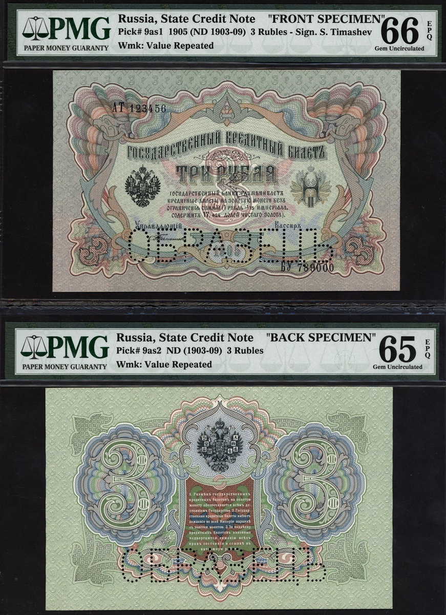 Russia, State Credit Note, obverse and reverse uniface specimen 3 rubles (2), ND (1905), obverse green on multicolour, value at centre, signature of Governor S.I. Timashev at lower left, serial number BU 789000 at lower right, reverse green on multicolour, guilloche patterns, double headed eagle at upper centre