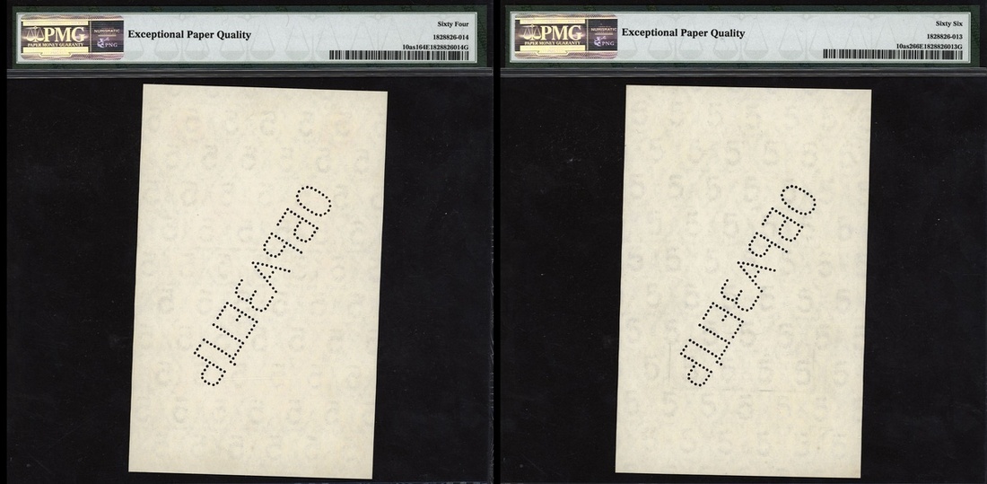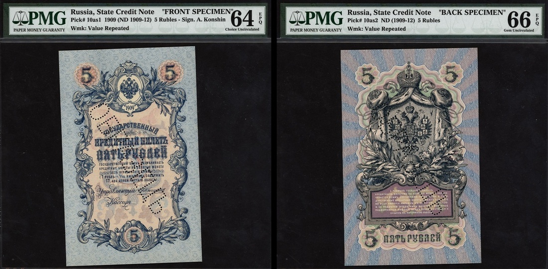 (Pick 10as1, 10as2, RPM 1.16.39O), perforated specimen (obrazets) in Cyrillic, in PMG holders obverse 64 EPQ Choice Uncirculated, reverse 66 EPQ Gem Uncirculated, appealing design, very rare (2 notes)
