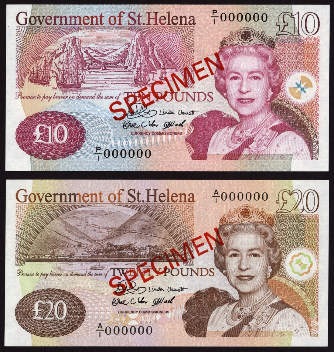 (x) Government of St. Helena, specimen £10 and £20, 2004, prefixes P/1, A/1, (Pick 12s, 13s), uncirculated (2 notes)
