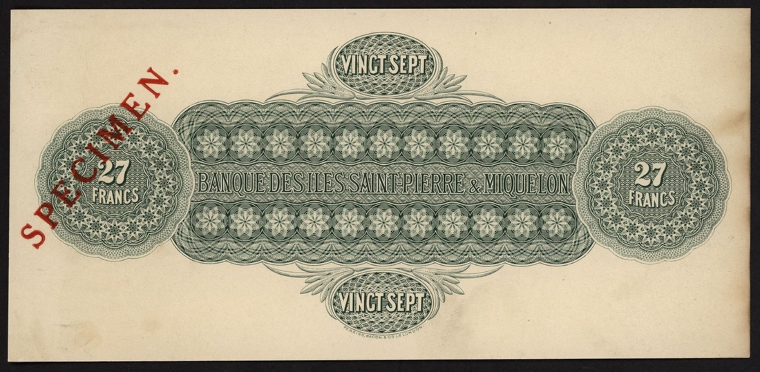 Banque des iles Saint-Pierre & Miquelon, reverse proof 27 francs, ND (1895), green,