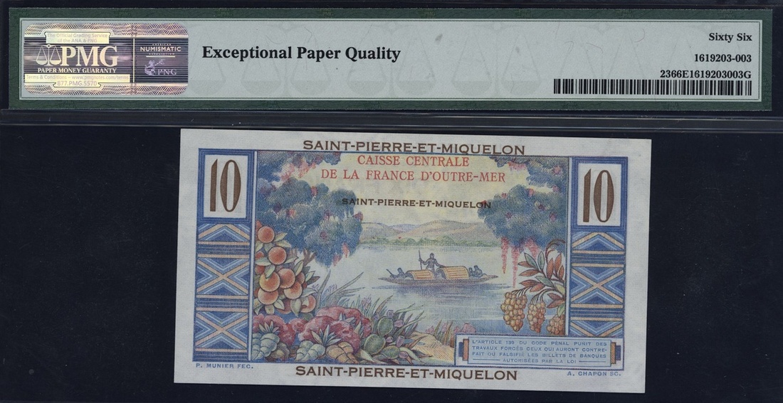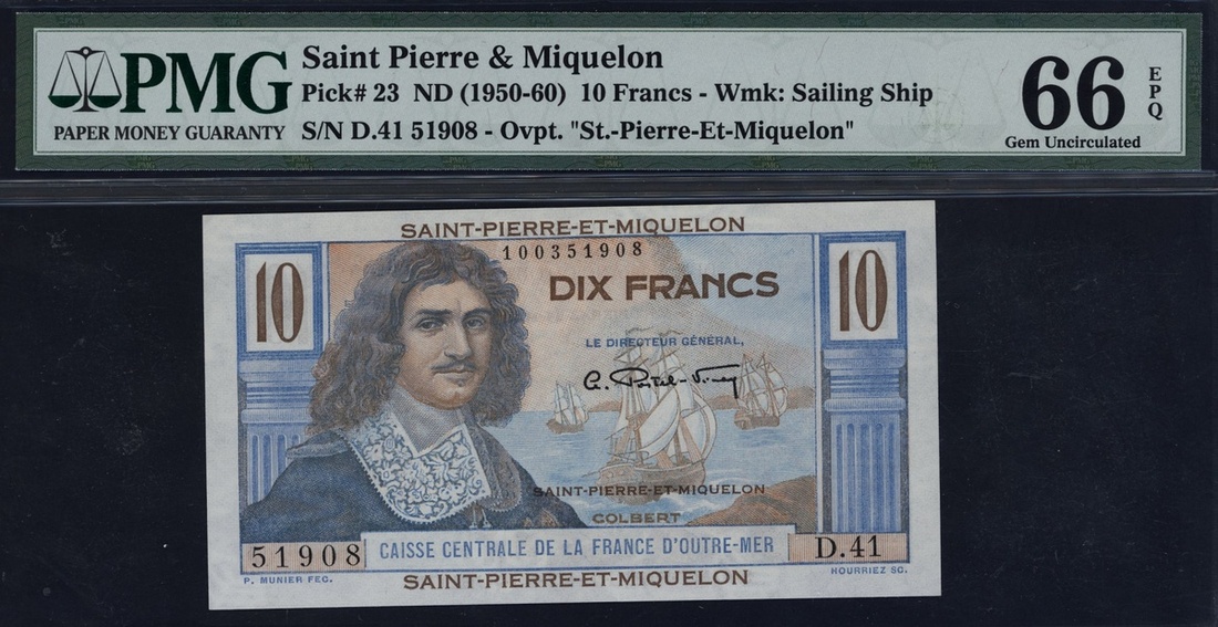 (x) Saint Pierre & Miquelon, 10 francs, ND (1950-60), serial number D.41 51908, (Pick 23), in PMG holder 66 EPQ Gem Uncirculated