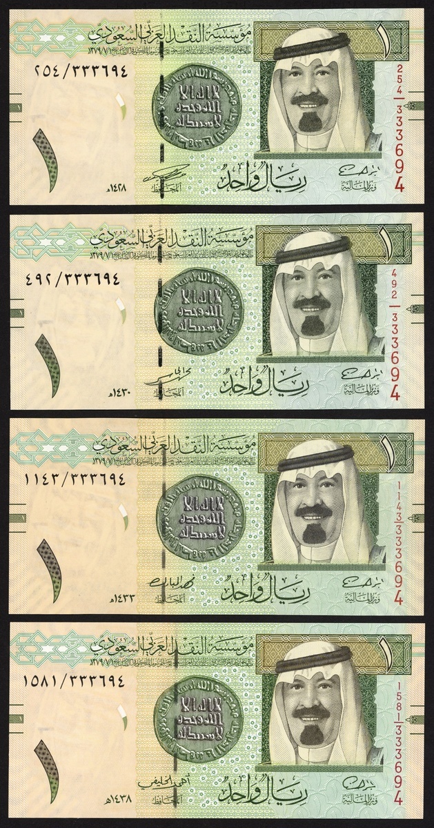 (x) Saudi Arabian Monetary Authority, a matching serial number 333694 set of 1 riyal with various signatures, (Pick 31a-d, TBB B130a-d), in presentation booklet, as issued (4 notes)