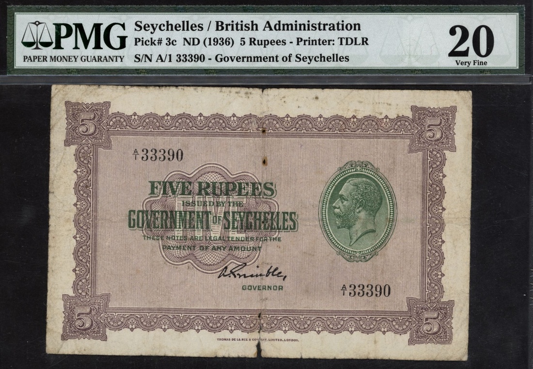 (x) Government of Seychelles, first prefix 5 rupees, ND (1936), serial number A/1 33390, (Pick 3c), in PMG holder 20 Very Fine, splits