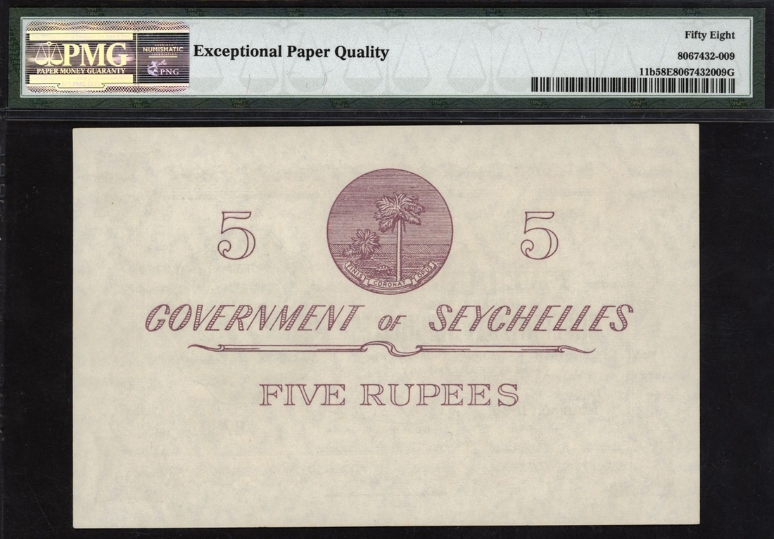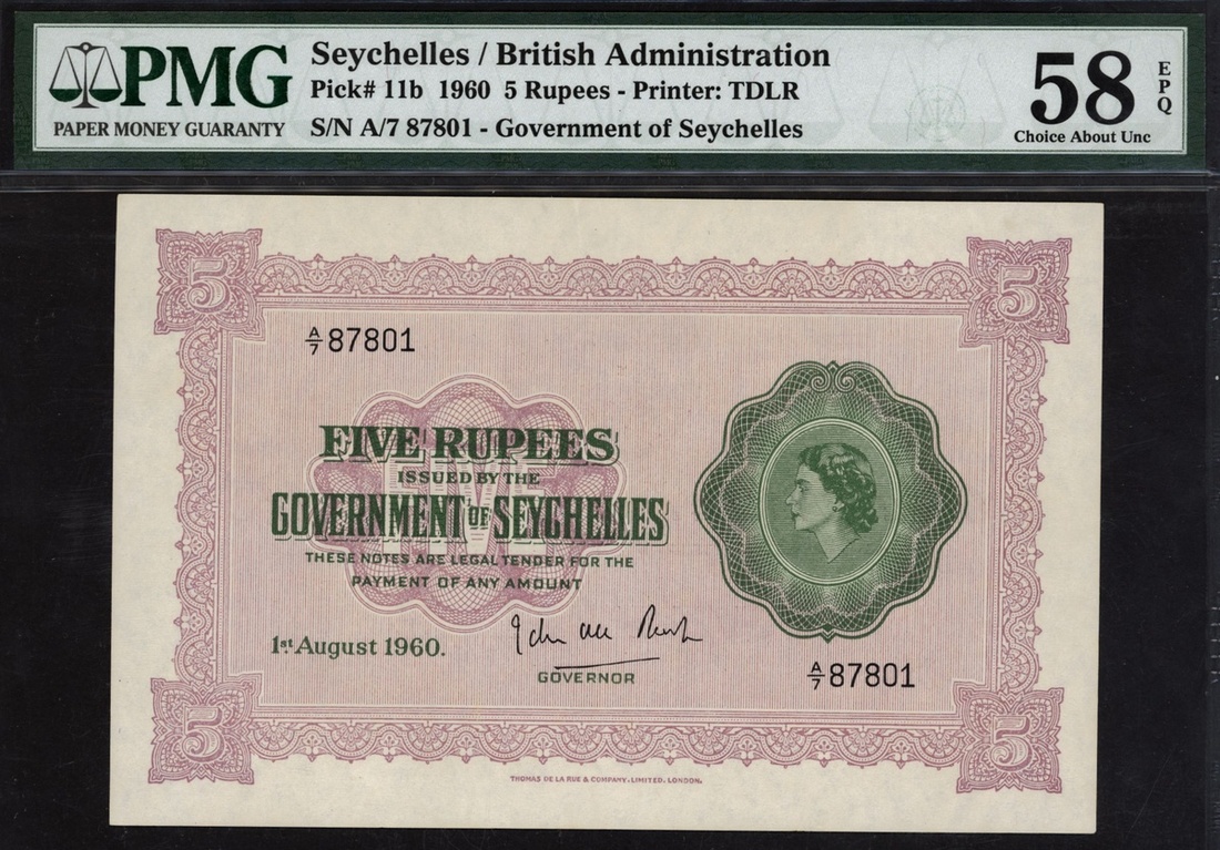 (x) Government of Seychelles, 5 rupees, 1960, serial number A/7 87801, (Pick 11b), in PMG holder 58 EPQ Choice About Uncirculated