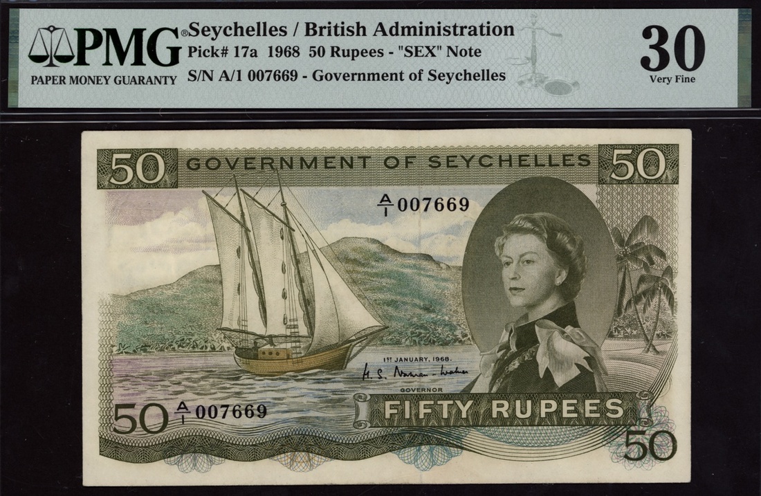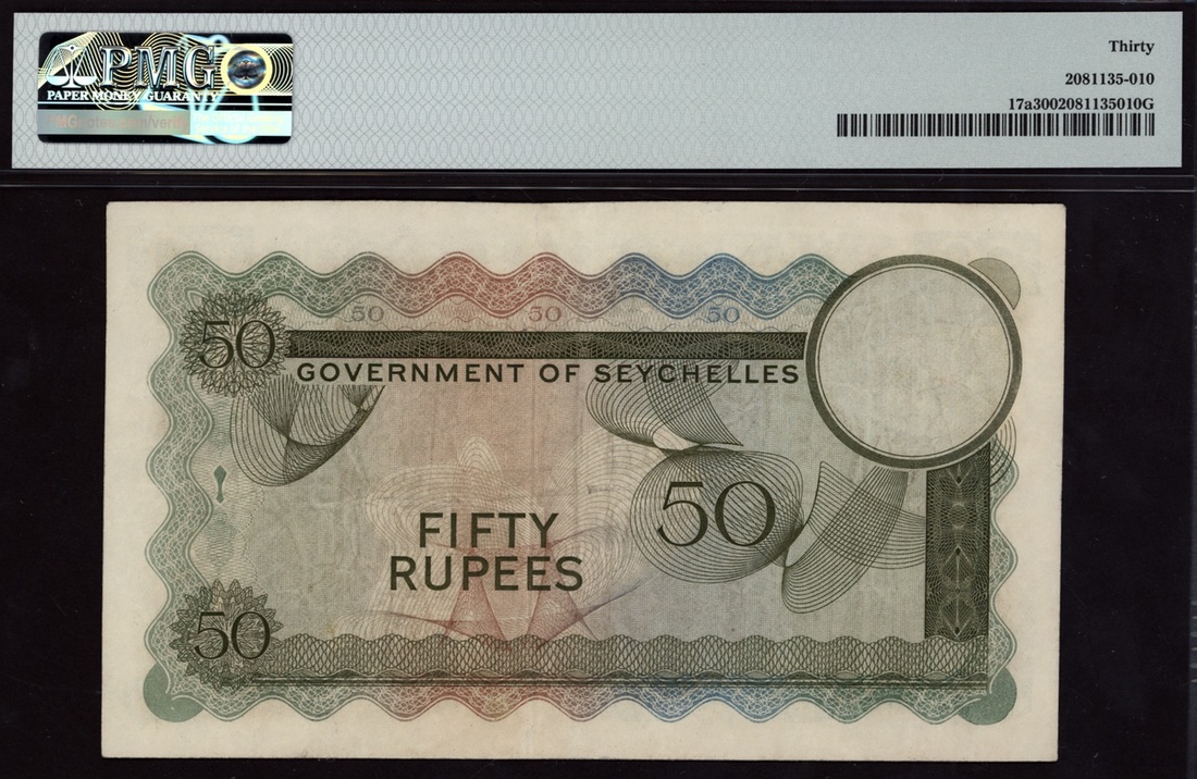 (x) Government of Seychelles, 50 rupees, 1 January 1968, serial number A/1 007669, (Pick 17a, BNB B124a), in PMG holder 30 Very Fine