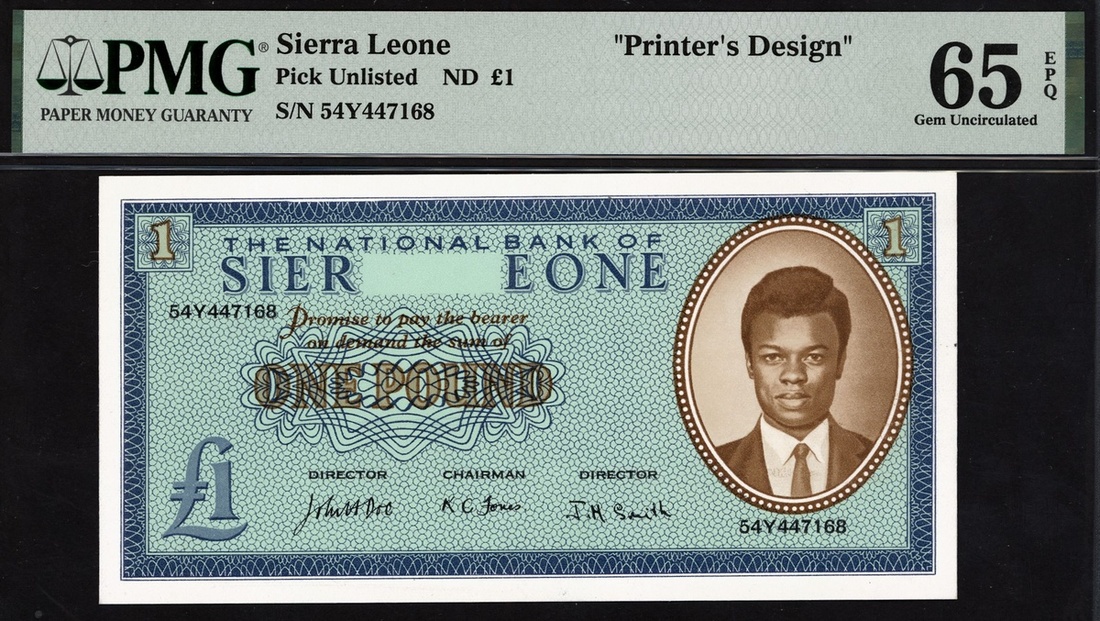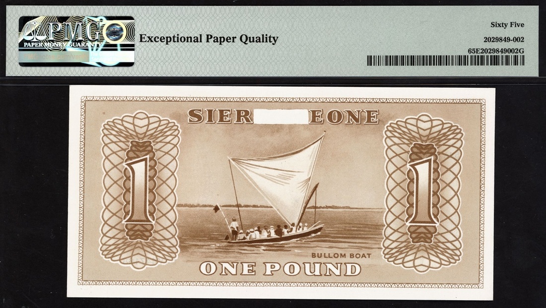 National Bank of Sierra Leone, a Harrisons printers trial for a proposed issue of £1, ND (ca serial number 54Y447168, blue and blue-green with lattice work background, value at left and portrait of man at right in oval frame, reverse brown, bullom boat at centre