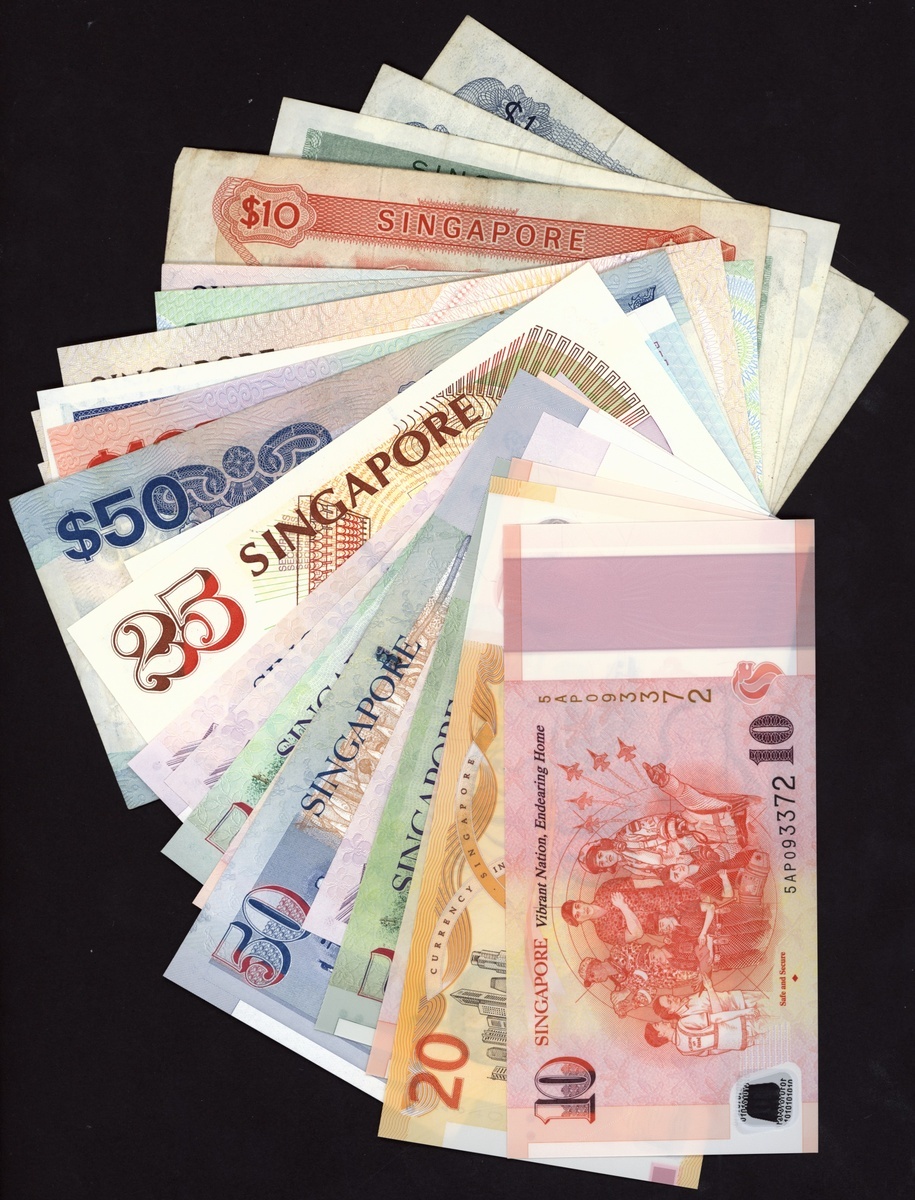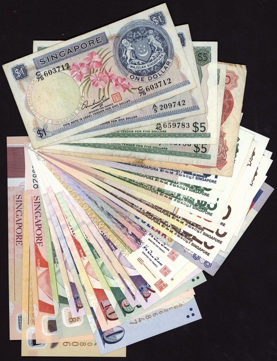 Singapore, including 1967-73 $1 (2), $5 (2), $10, 1976-80, $1, $5 (2), $10, consecutive $20 (3), 1984-97 issues $1, $2, $5, $10, $50, 1991-98 $2 (2), 1996 commemorative $25, 1999 $2 (2), $5, $10, $50, 2000 commemorative $2, 2006-21 polymer issues $5, $10, 2007 commemorative $20, 2015 commemorative $10,