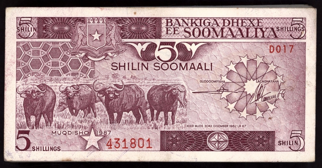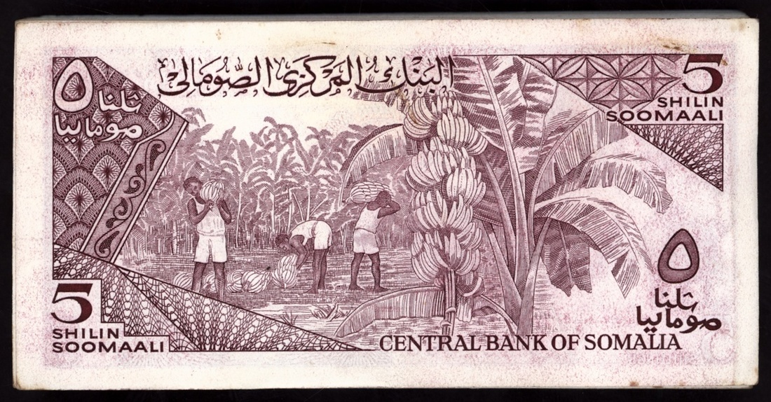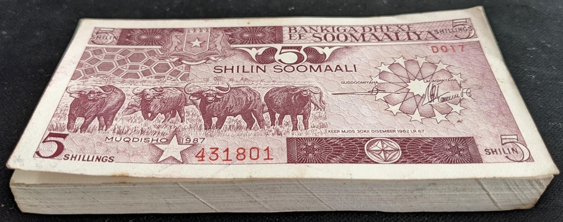 (x) Central Bank of Somalia, a bundle of 5 shillings (100), 1987, prefix D017, (Pick 31b, BNB B306b), minor dirt, generally about uncirculated (100 notes)
