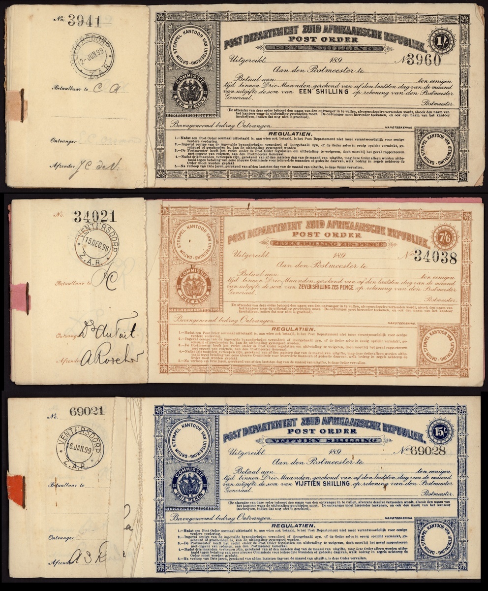 (x) South African postal orders, three unsigned booklets, 1/-, 7/6- (3), 15/- (11), 189-, generally very fine (3 booklets)