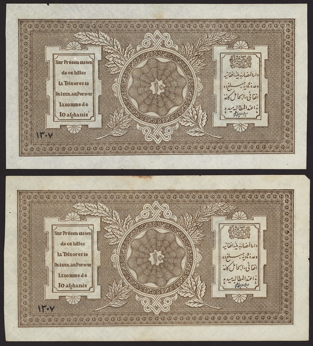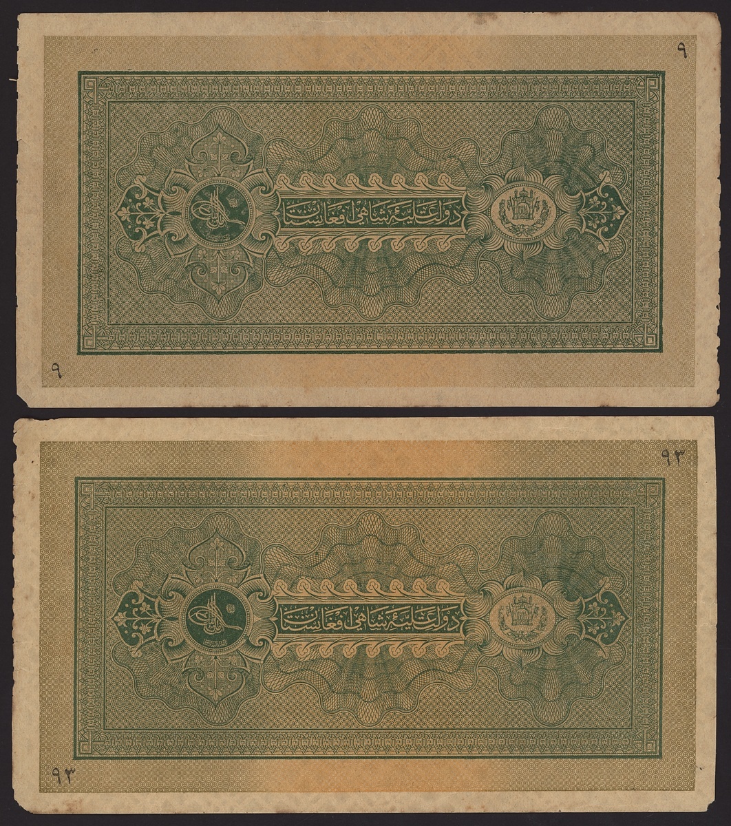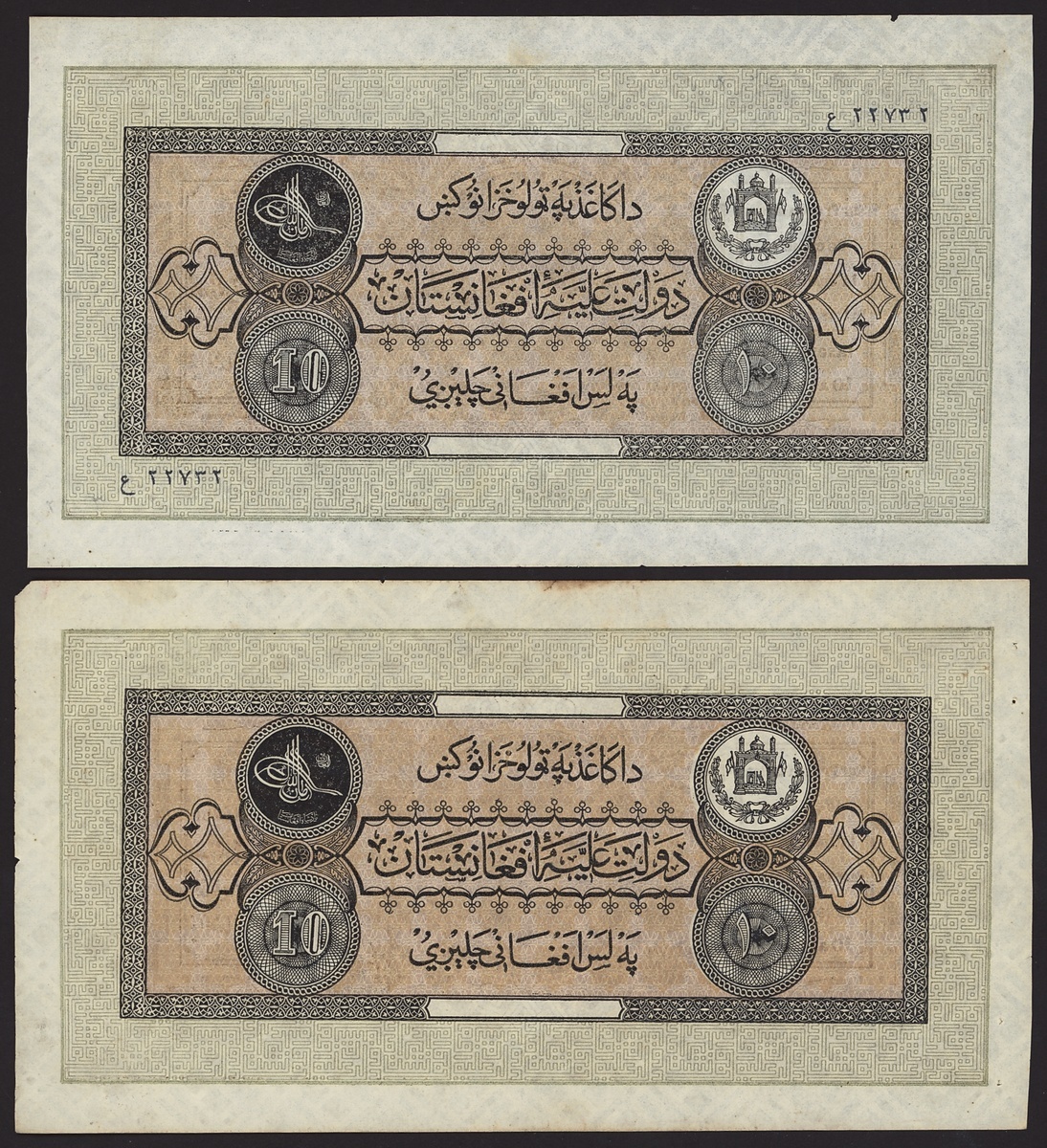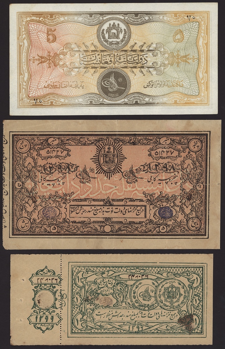 (x) Afghan Treasury, a group of the 1919-29 issues, including 1 rupee (2), 5 rupees, 1919-20 issues, 5 afghanis, 10 afghanis (2), 50 afghanis (2), 1926-28 issues, 5, 10 and 50 afghanis 1928, also a Ministry of Finance 2 afghanis,