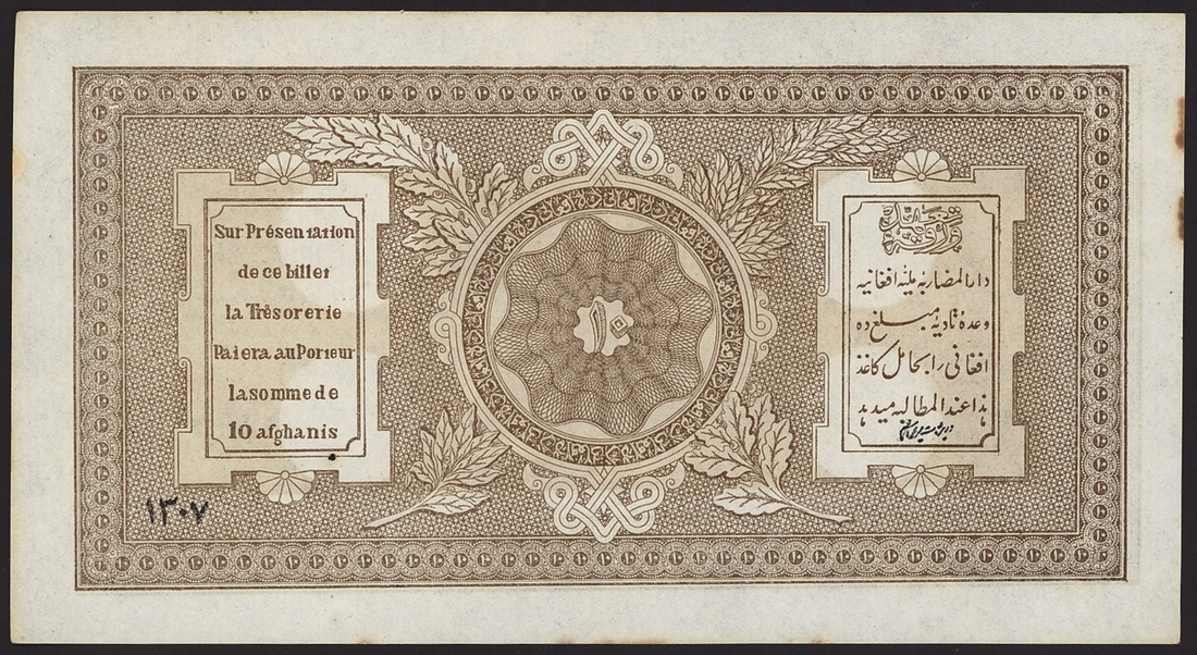 (x) Afghan Treasury, proof 10 afghanis, 1928, no serial numbers, (Pick 9 for type), missing overprints design on obverse, rust at margins, otherwise uncirculated