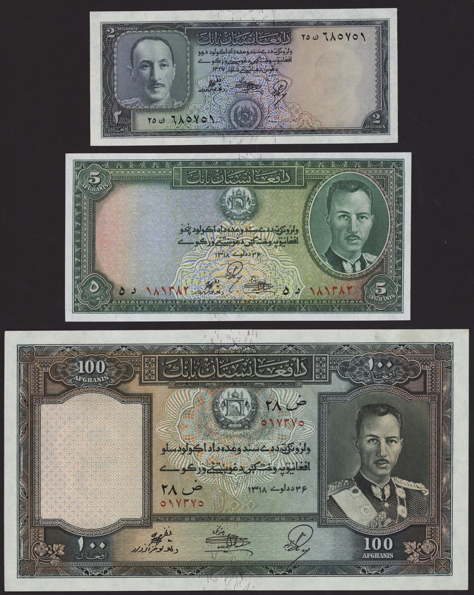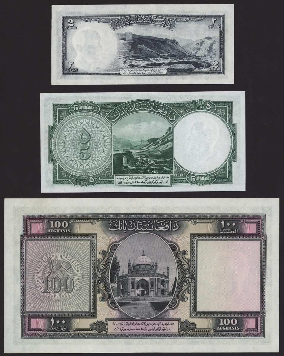 Da Afghanistan Bank, 5 and 100 afghanis, 1939, also 2 afghanis 1948,
