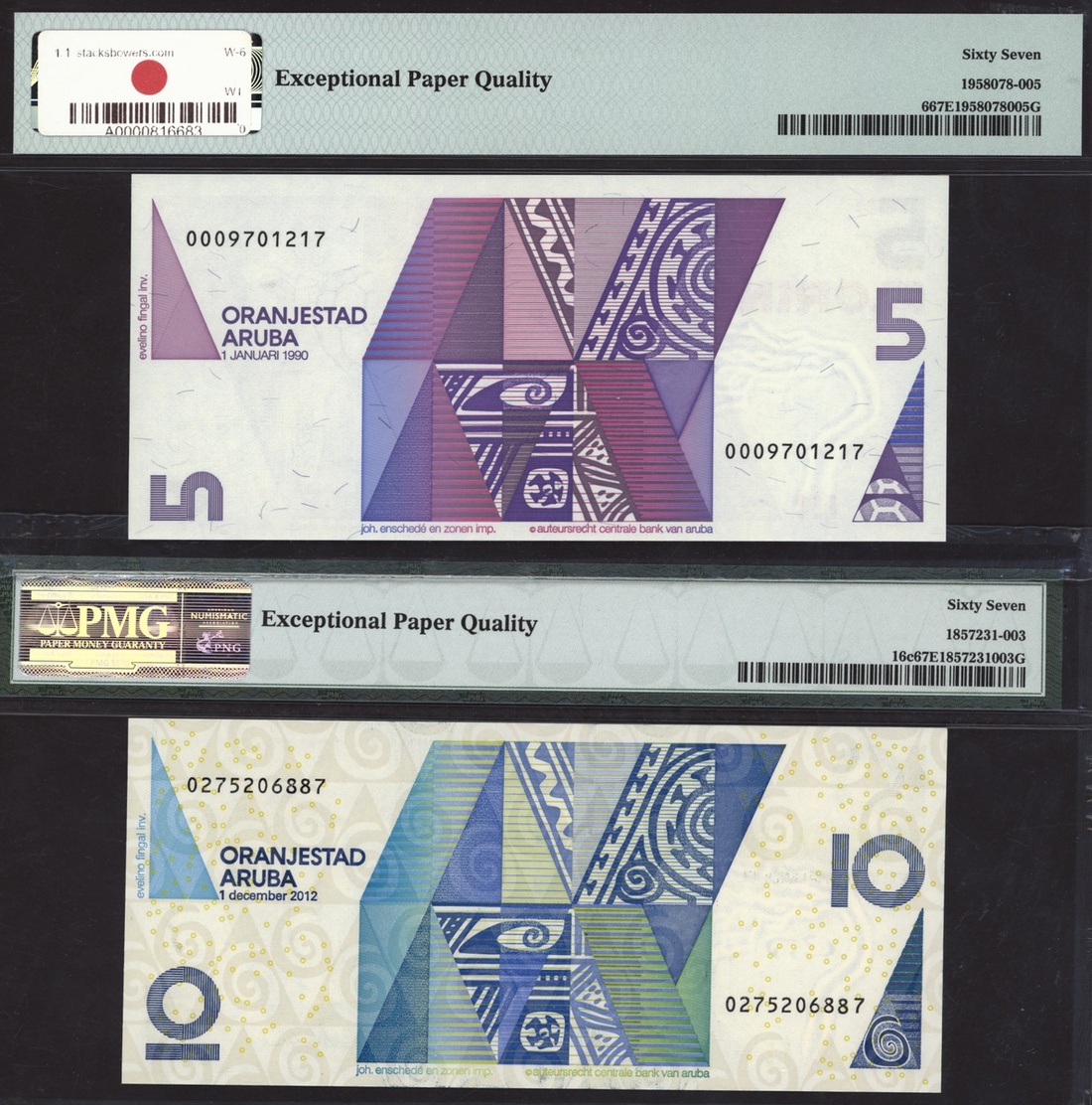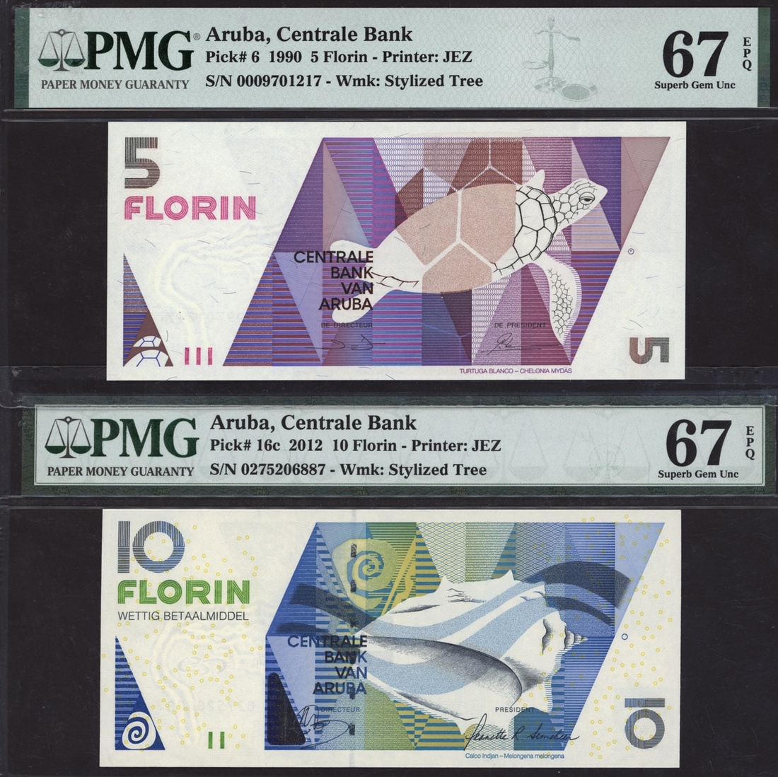 (x) Centrale Bank, Aruba, Pair of 5 & 10 florin, 1990, 2012, (Pick 6, 16c), In PMG holder 67 EPQ Superb Gem Uncirculated, (2 notes).