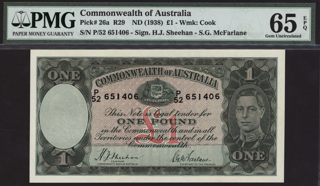 (x) Commonwealth of Australia, £1, ND (1938), serial number P/52 651406, (Pick 26a, BNB B132a), in PMG holder 65 EPQ Gem Uncirculated. One higher grade example on PMG Census