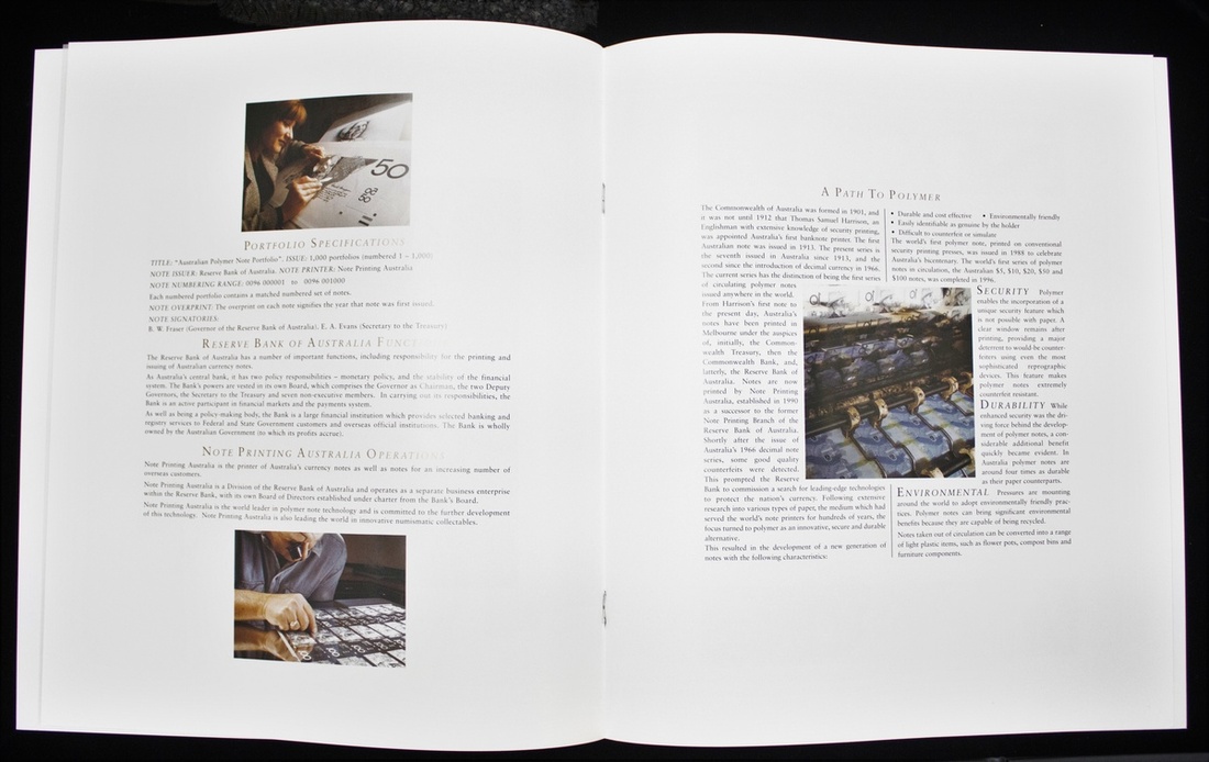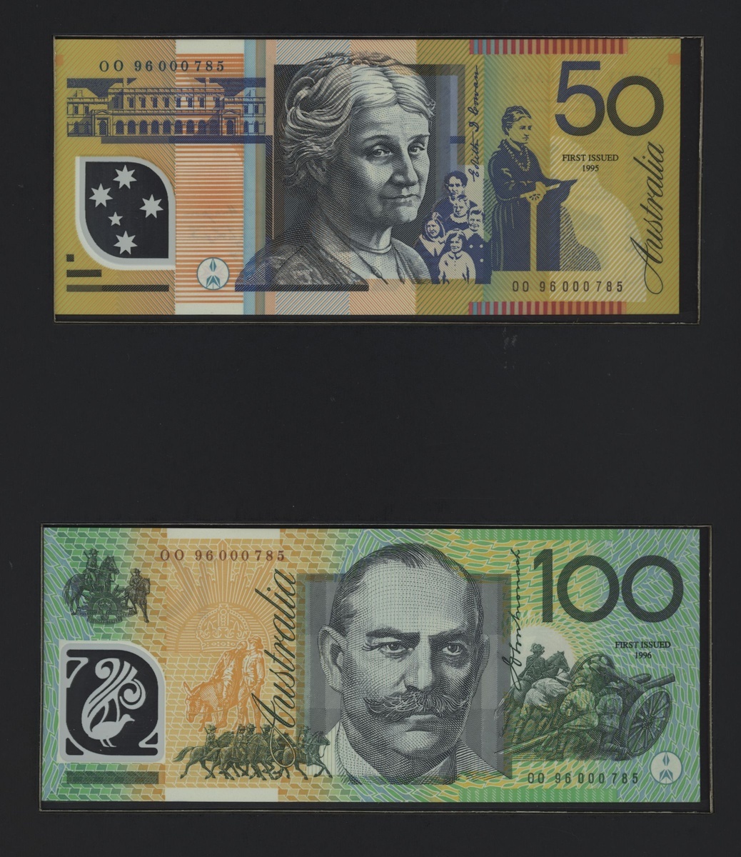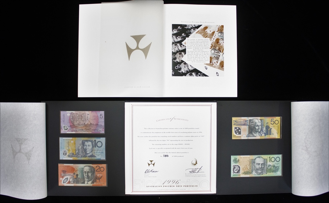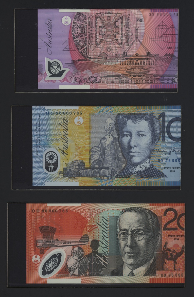 Australian Polymer Note Portfolio, Album Matching serial number set of 5 notes, first polymers, 1992-6, serial number 00 96000785, (Pick 51-55), uncirculated, (5 notes).