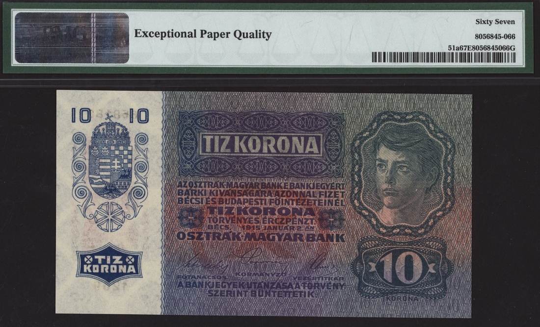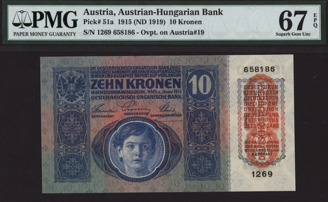 (x) Austrian-Hungarian Bank, 10 kronen, 1915 (ND 1919), serial number 1269 658186, (Pick 51a), in PMG holder 67 EPQ Superb Gem Uncirculated
