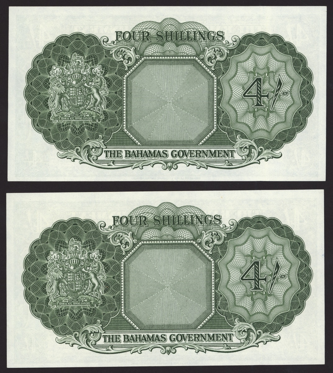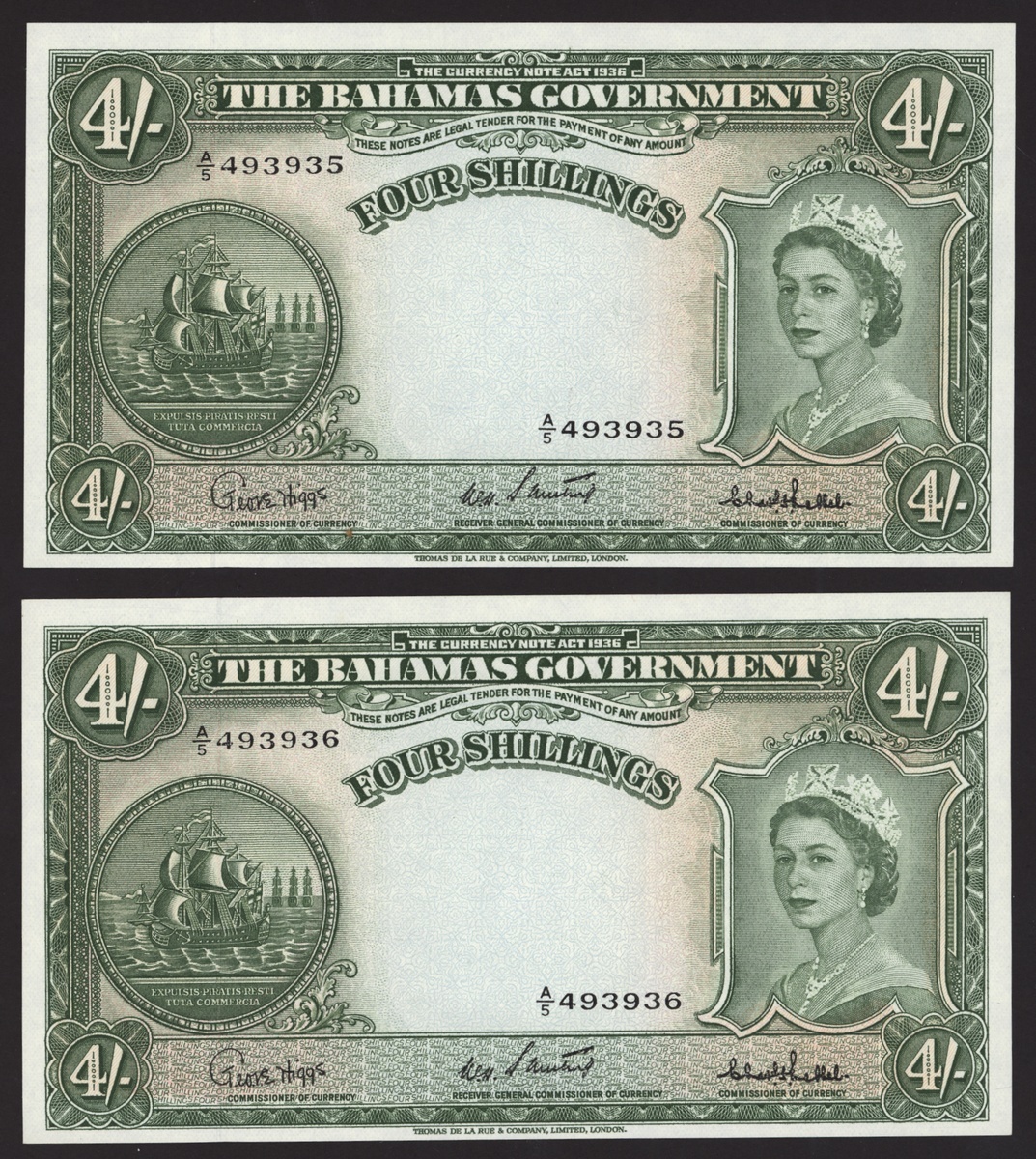 The Bahamas Government, Consecutive pair 4 shillings, 1953, serial numbers A/5 493935-6, (Pick 13c, B112c), uncirculated (2 notes).