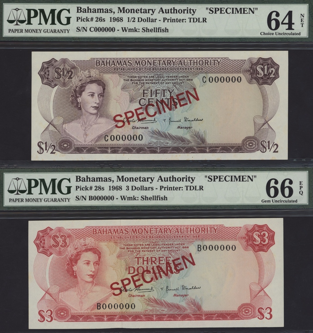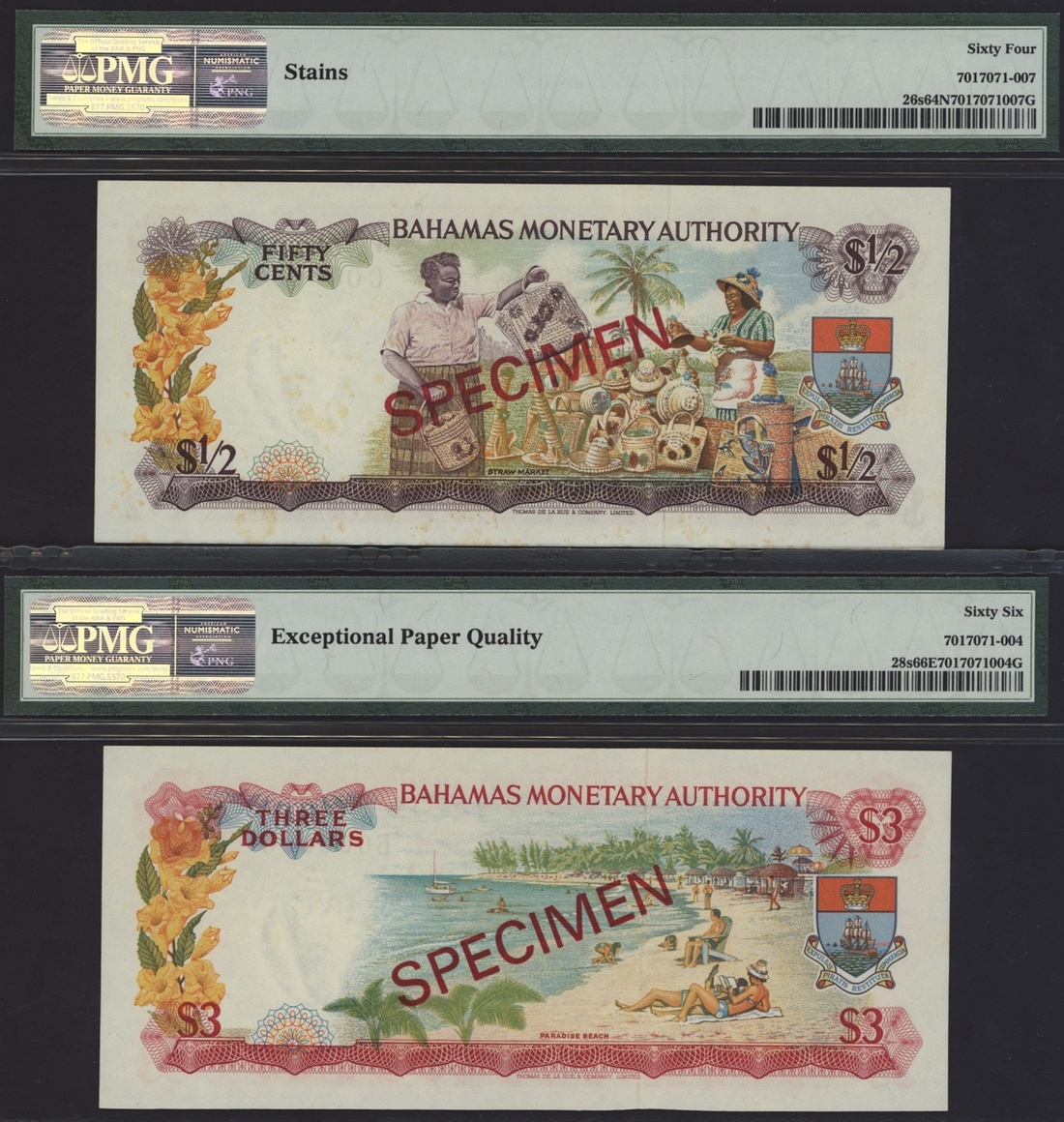 (x) Bahamas Monetary Authority, specimen 1/2 dollar and 3 dollars, 1968, (Pick 26s, 28s, BNB 201s, 203s), in PMG holders (stains) 64 NET, 66 EPQ (2 notes)