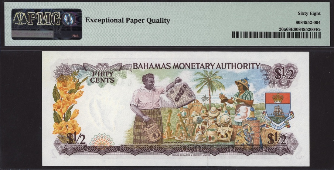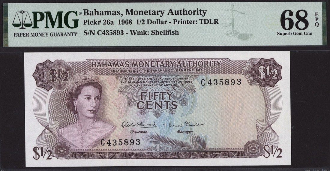 (x) Bahamas Monetary Authority, [Top Pop] 1/2 dollar, 1968, serial number C435893, (Pick 26a), in PMG holder 68 EPQ Superb Gem Unc